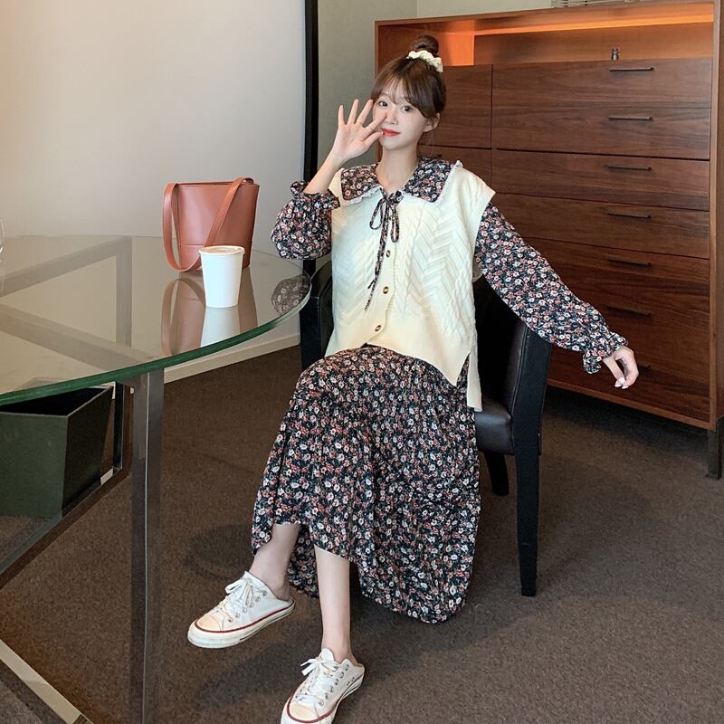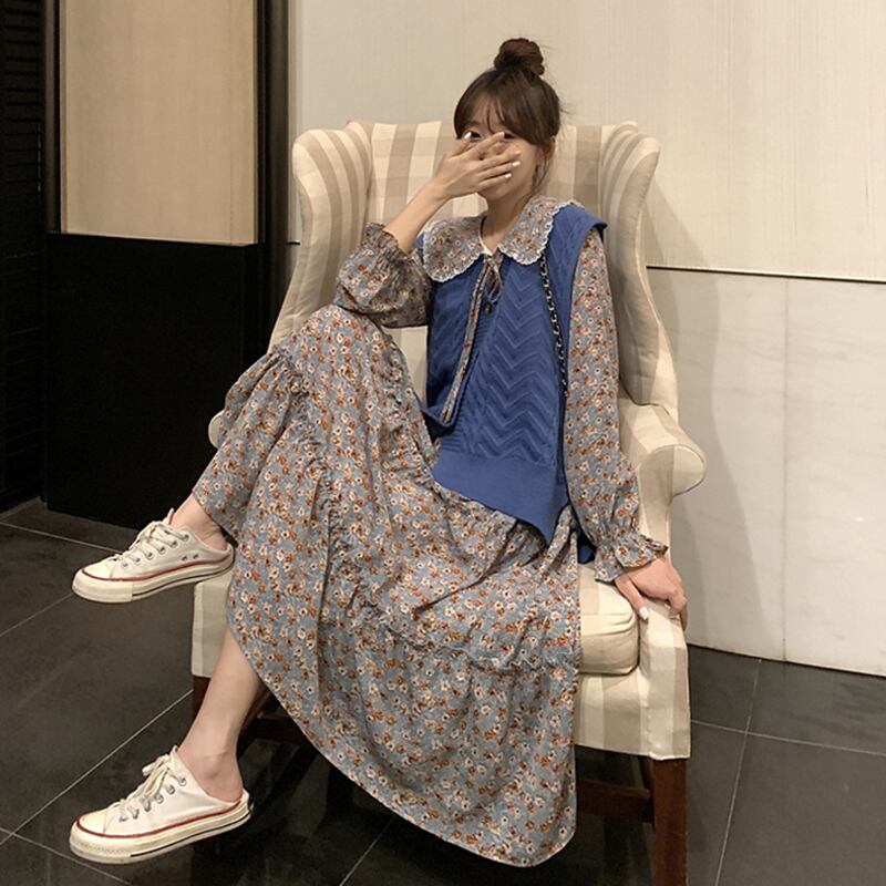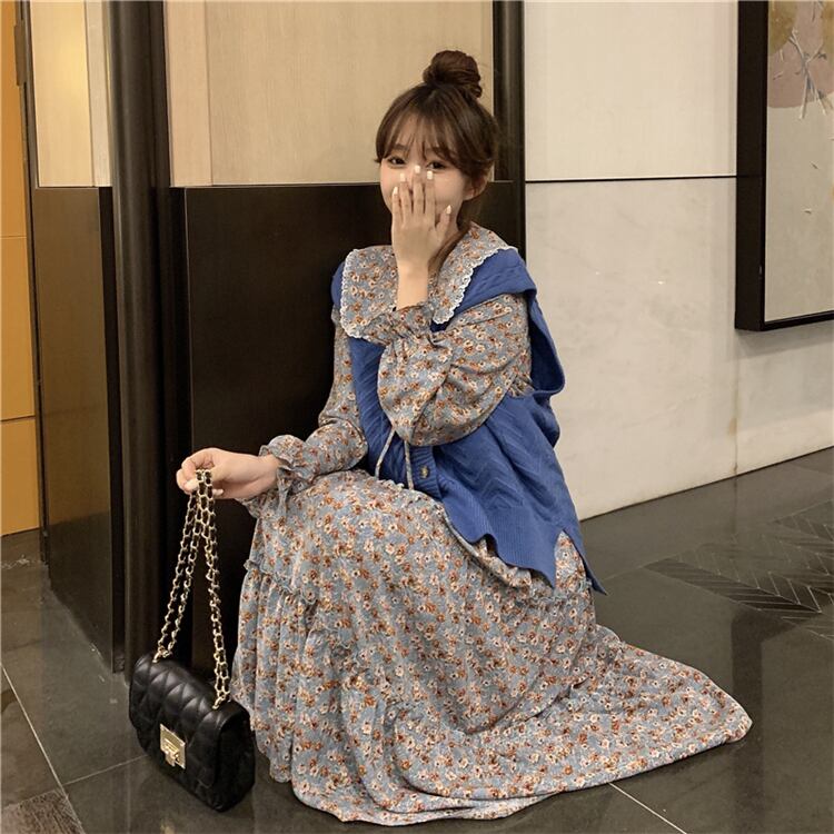 フローラルワンピースレディーススプリングスタイル韓国ファッションスカート ロング 春物 花柄 長袖 ミドル丈 SPM13793634719