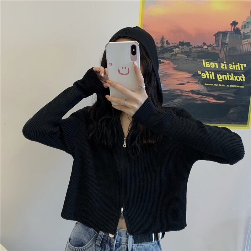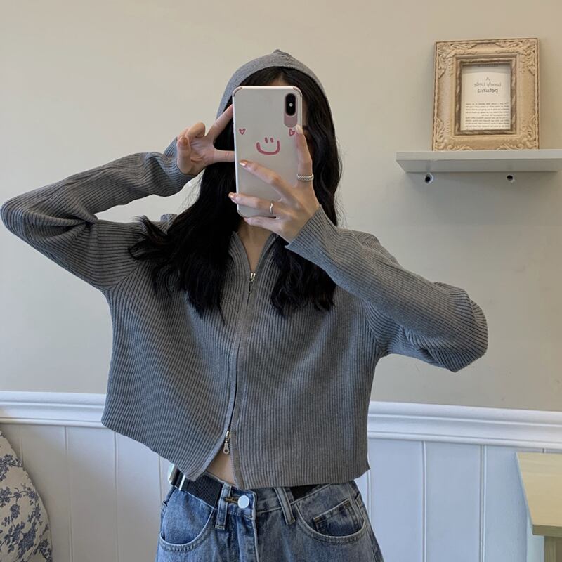 スプリングジッパーフードセーター スタイルカーディガンクロップドトップス 春物 SPM31462468227