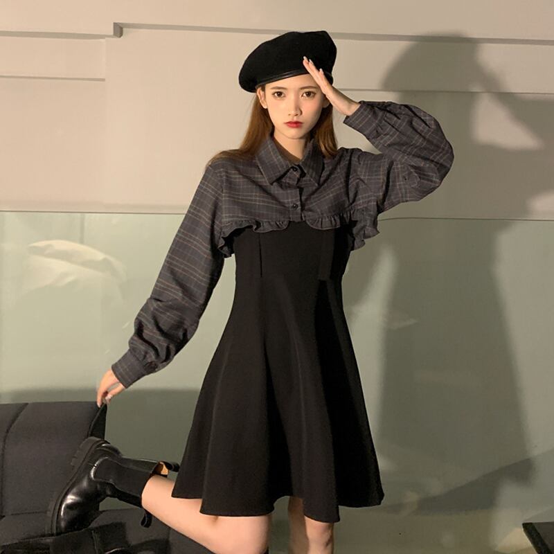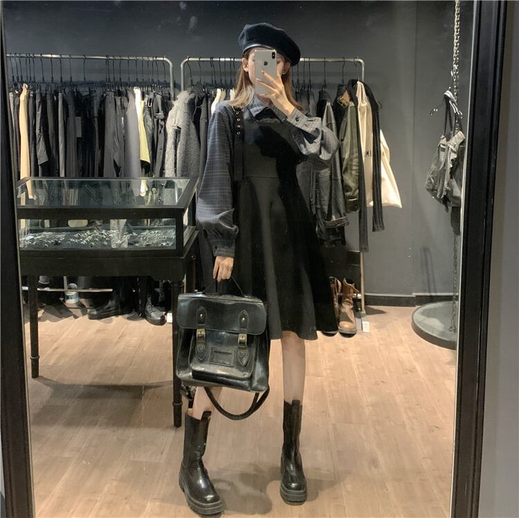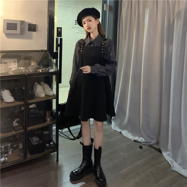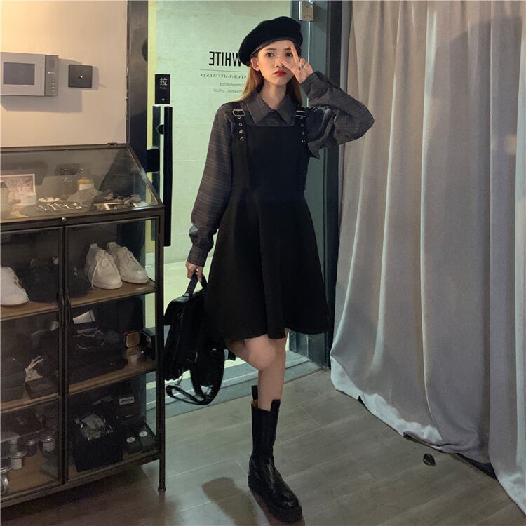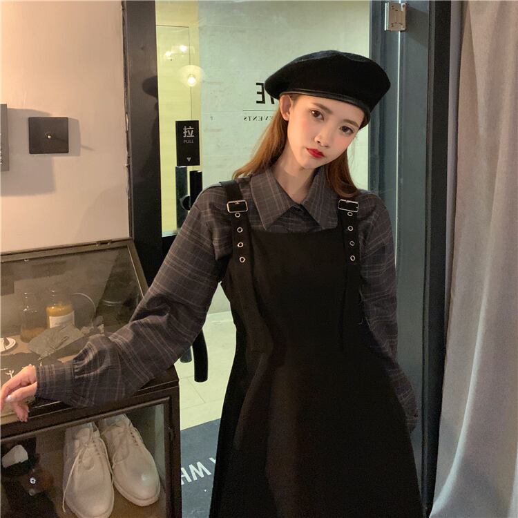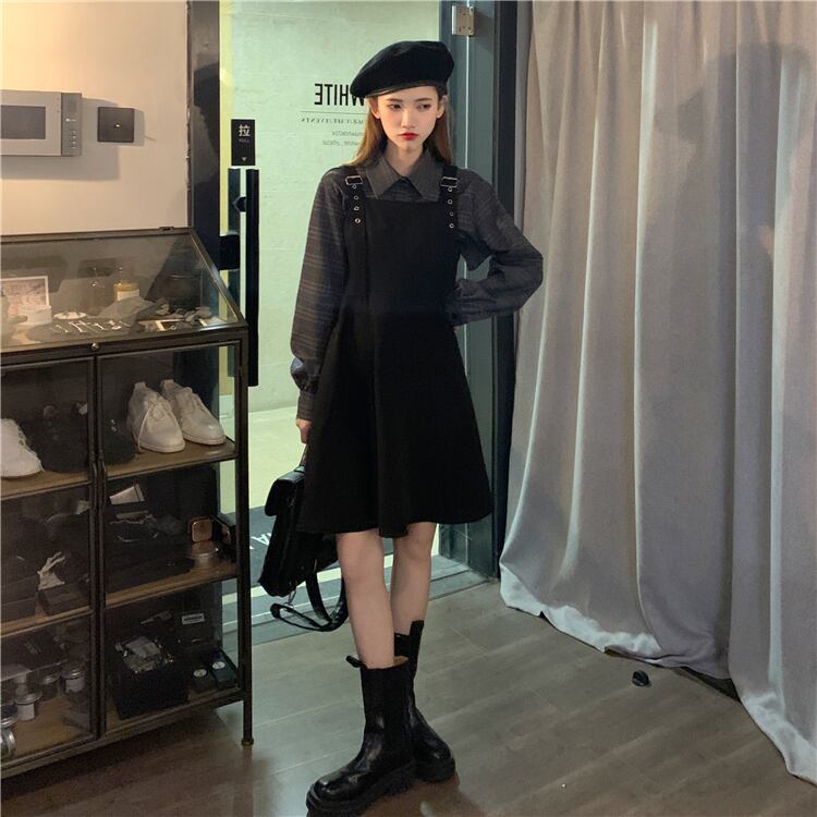 色:格子縞のシャツワンピース,ブラックストラップドレスワンピース