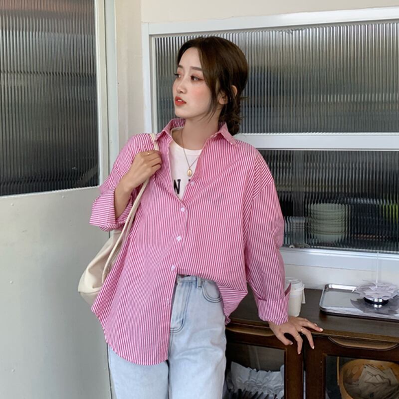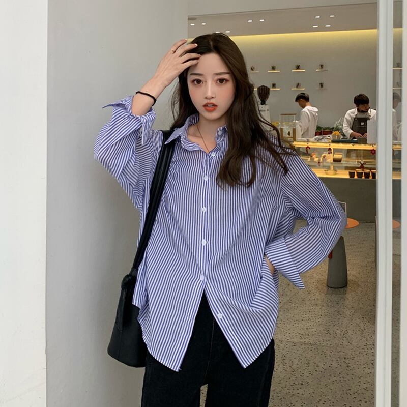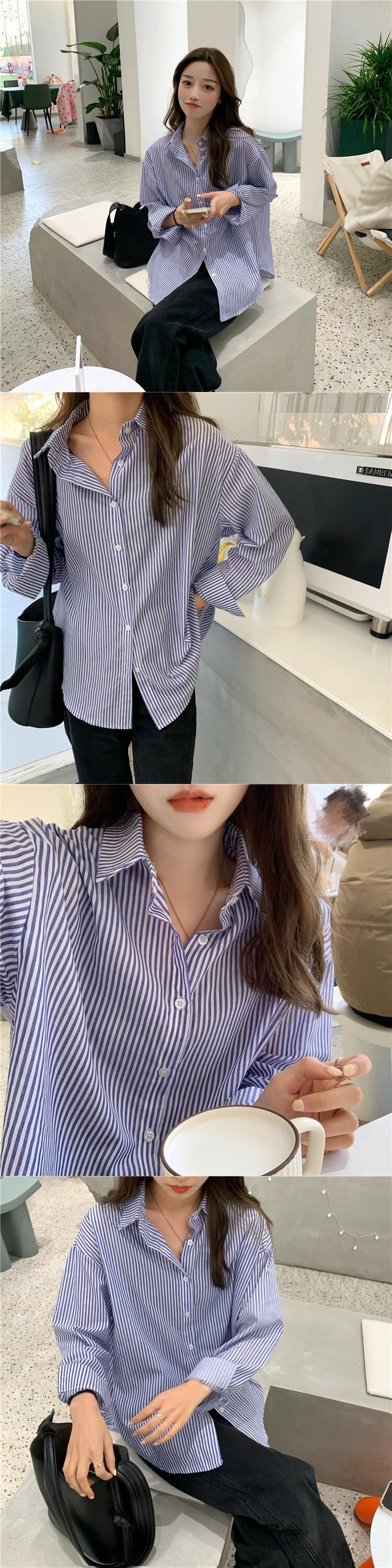ルーズストライプシャツ レディーススプリング韓国ファッションスタンダード ロング レトロ 春物 スタイル 長袖 SPM33517371017