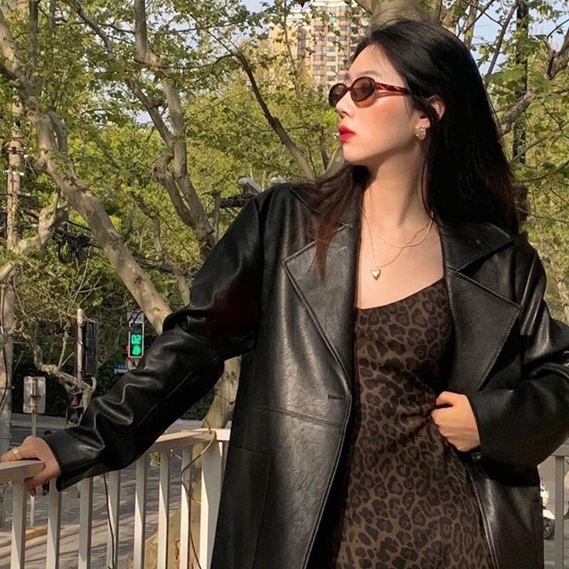 ブラックジャケット レディーススプリング韓国ファッションスタイルルーズレザー ロング 春物 長袖 ミドル丈 SPM14613884240