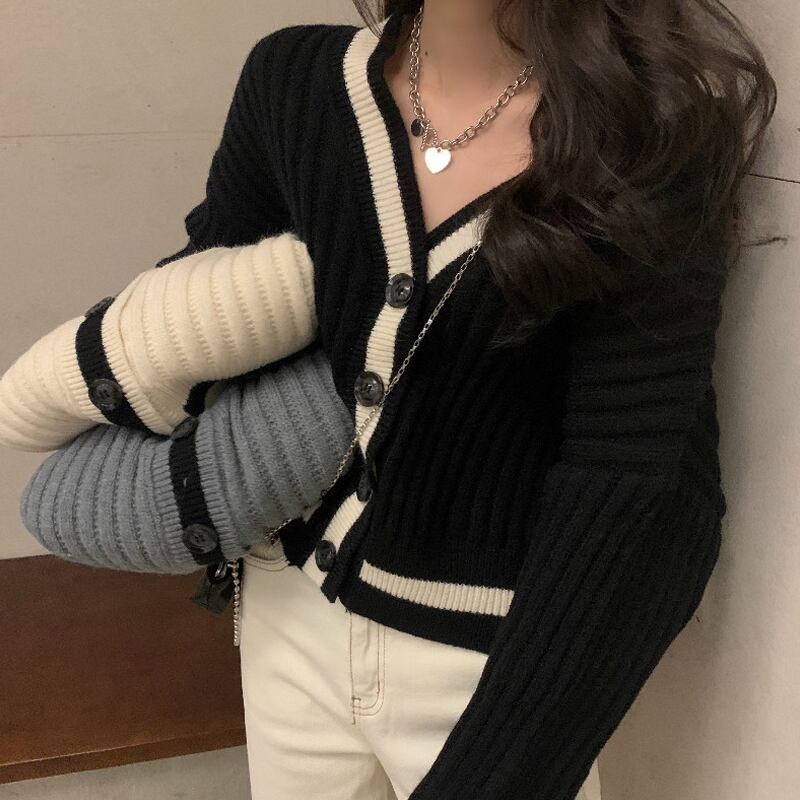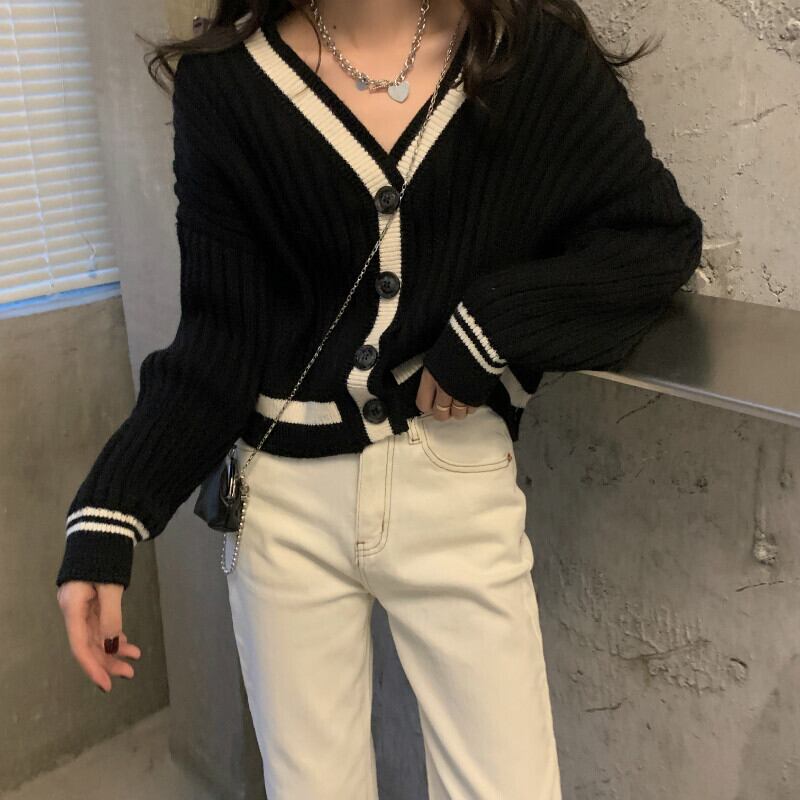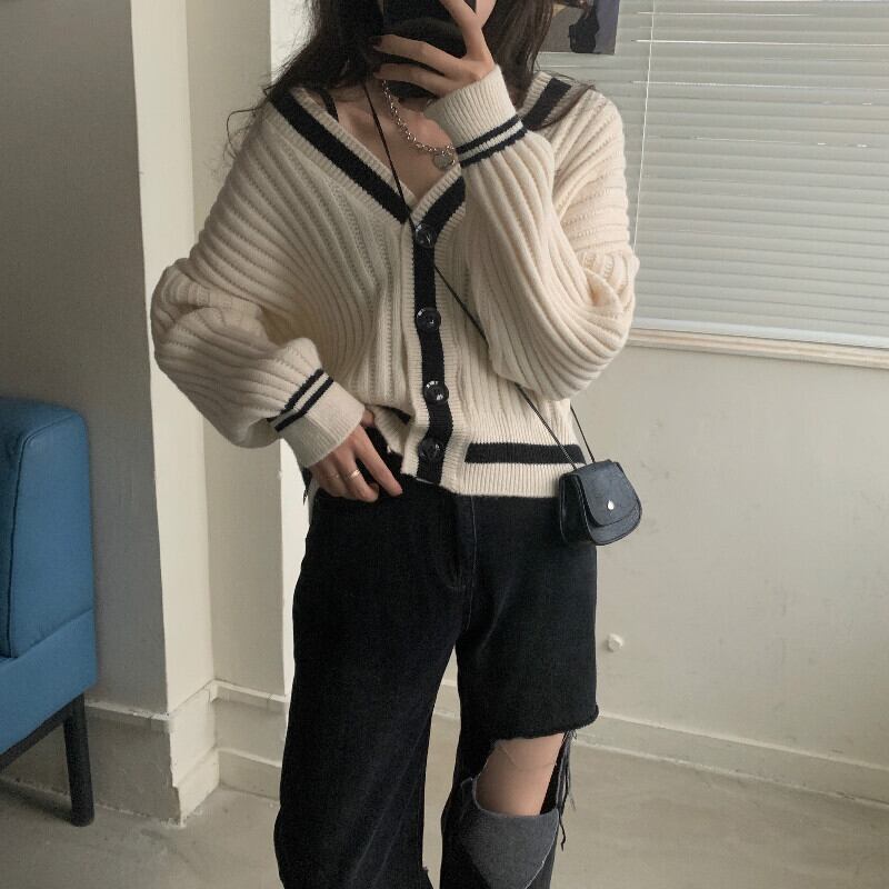 スプリング秋物スタイル韓国ファッションルーズショートセーター レディーススタンダードVネックカラーニットカーディガンジャケット ロング レトロ 春物 オータム 長袖 SPM33203937030