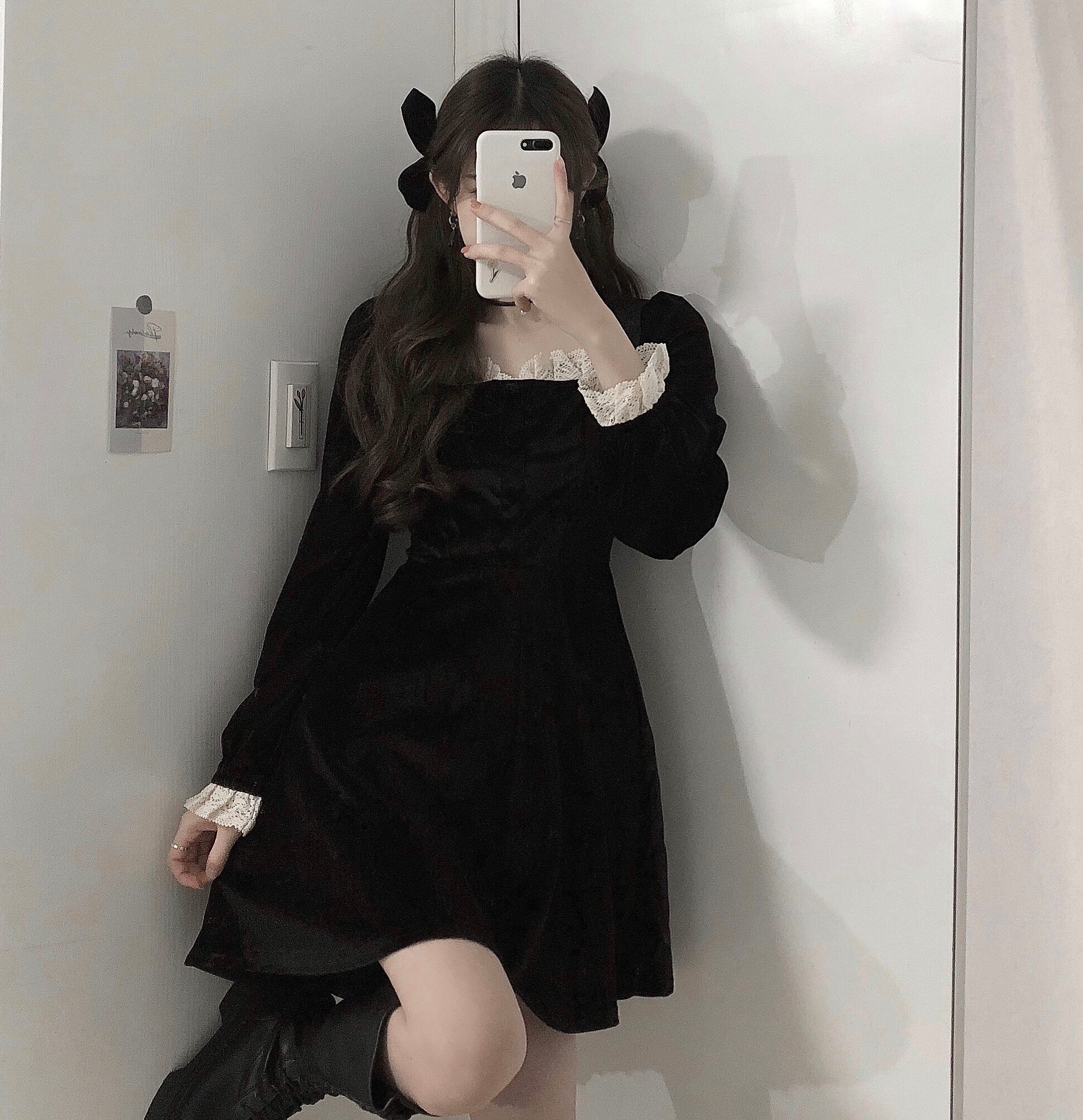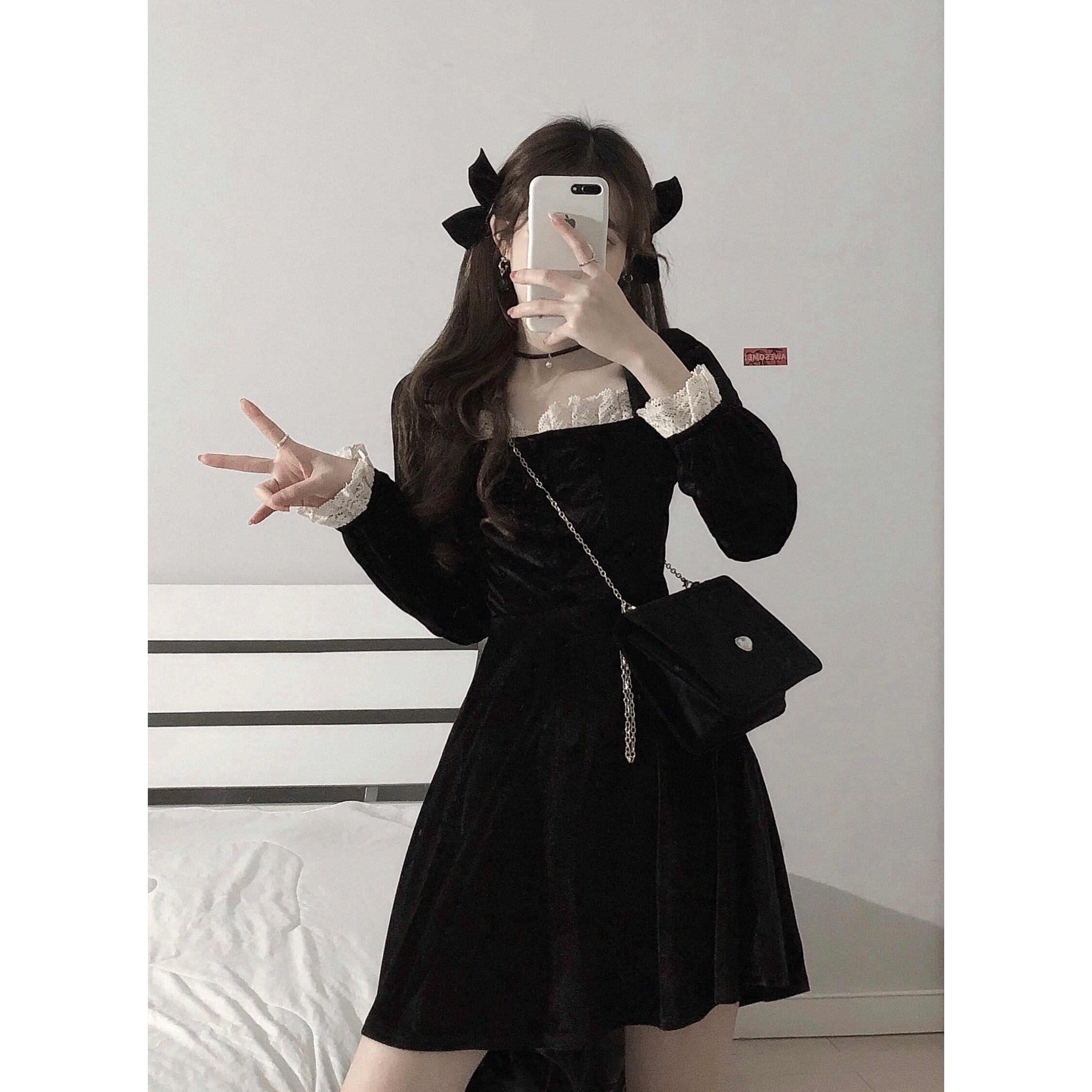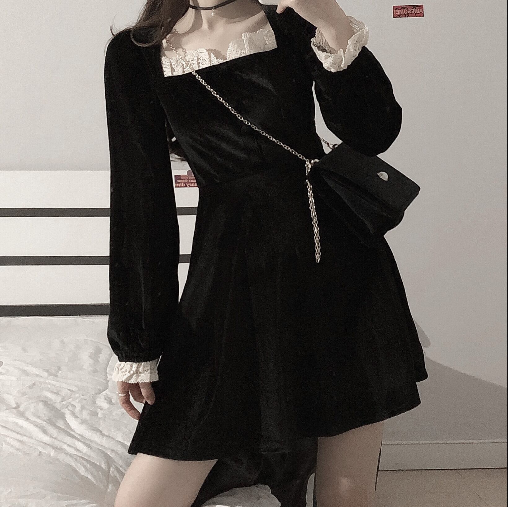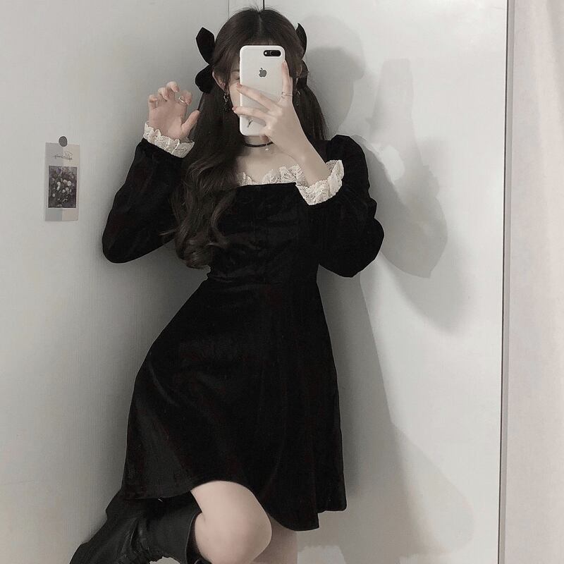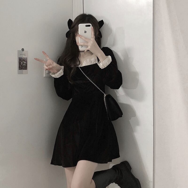 スプリングスタンダードレースワンピースレディースブラックウェストスカート レトロ 春物 ウエスト SPM97275634756