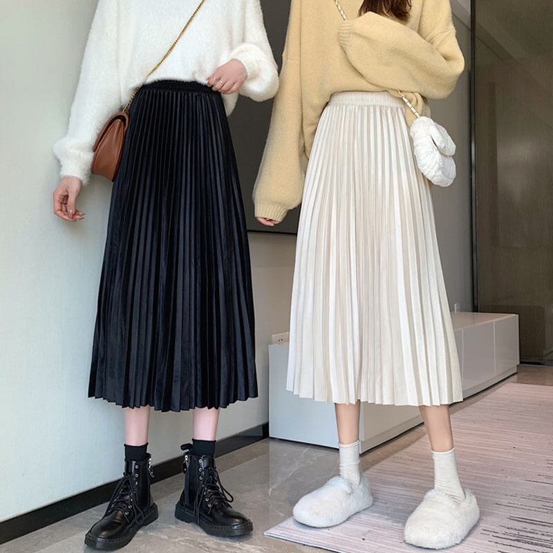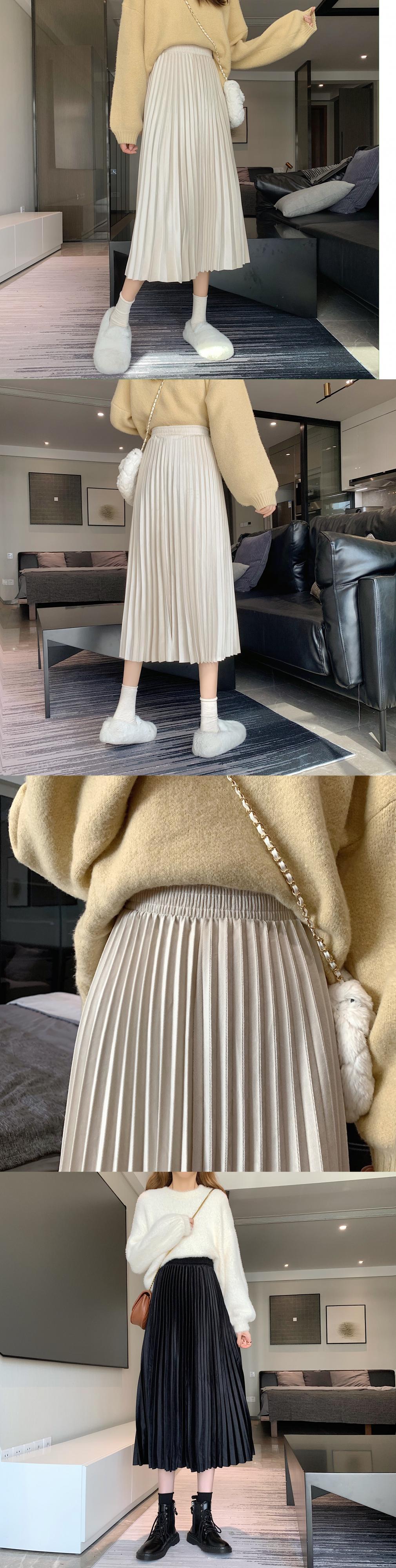 スプリング秋物厚みスカート レディースハイウェストウェストブラックプリーツ薄手Aライン 春物 オータム ウエスト ミドル丈 SPM31093182593