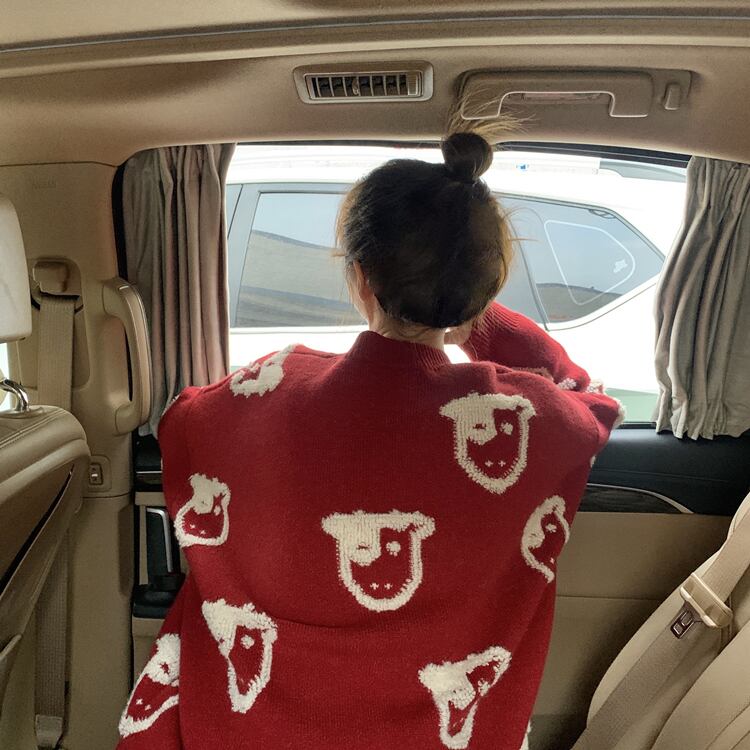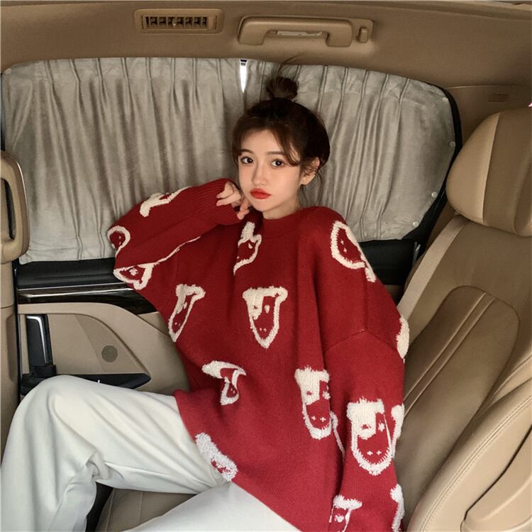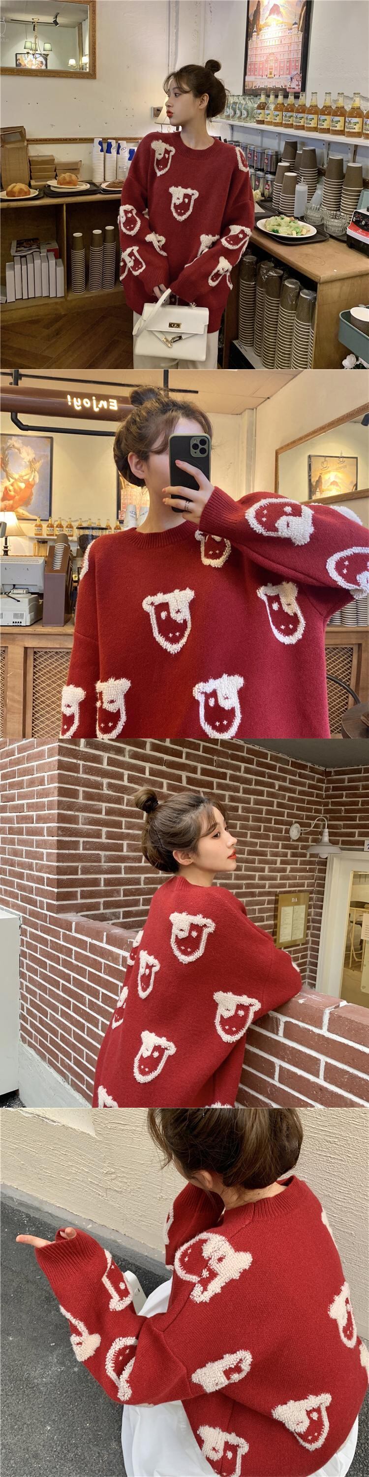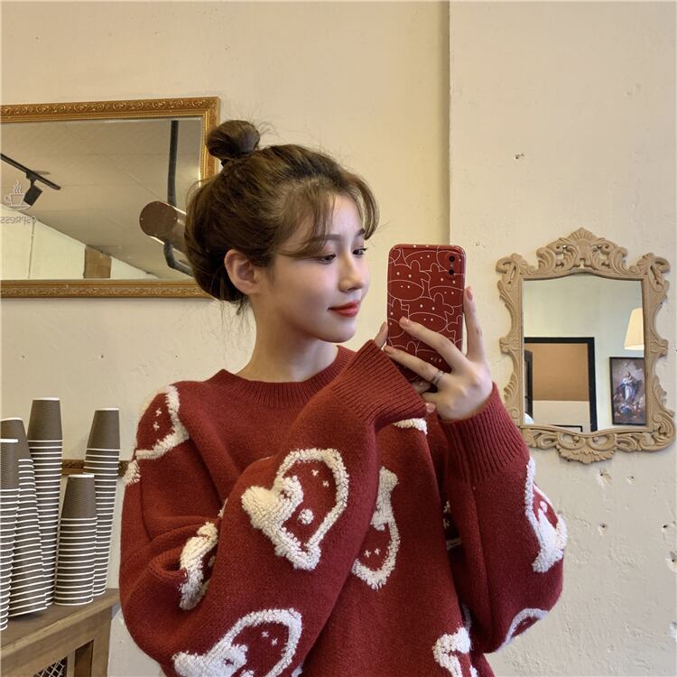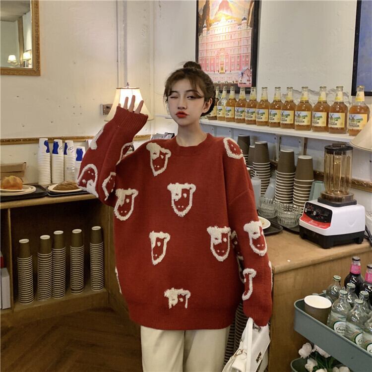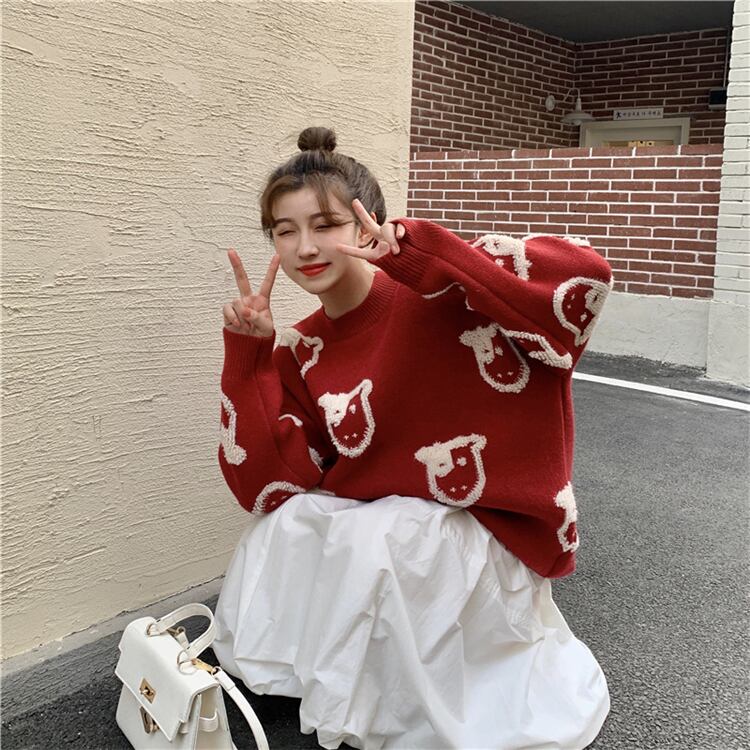 レッドセーター レディーススプリング秋物韓国ファッションルーズジャカードラウンドネック 春物 オータム Oネック スタイル SPM86769844396