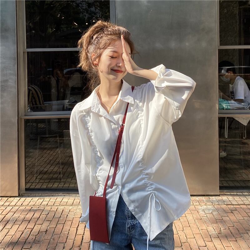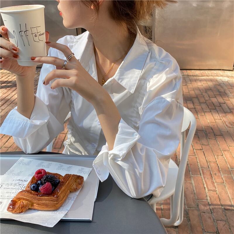 スプリングルーズギャザーホワイトシャツ レディースカラー ロング 春物 長袖 SPM71605745138