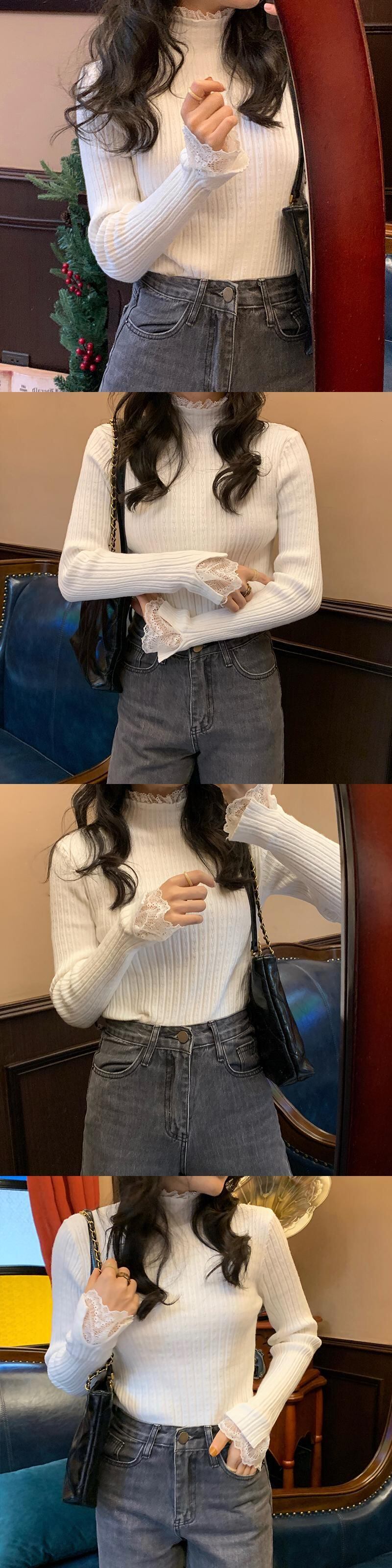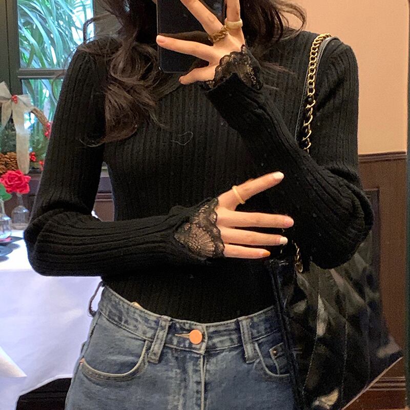 スプリングスリムセーター レースカラー ロング 大人ガーリー スウィート キュート カジュアル 春物 長袖 SPM26425959183