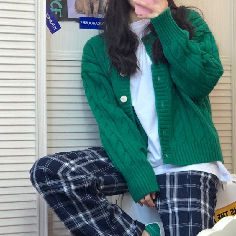 グリーンショートセーター レディーススプリング秋物スタイル韓国ファッションジャケット ニットカーディガン 春物 オータム SPM16355984722