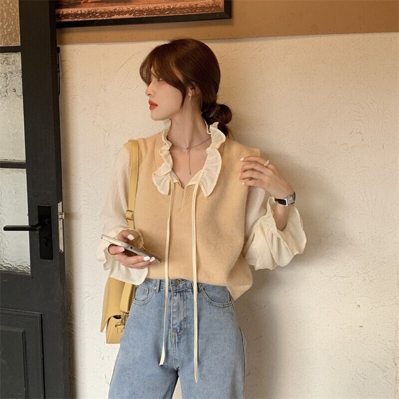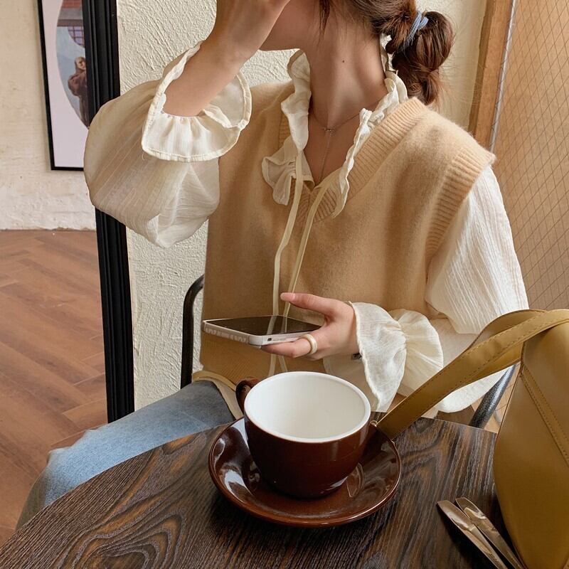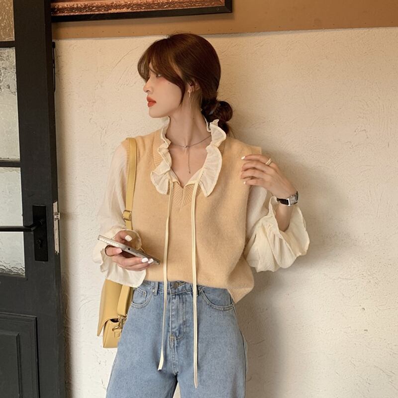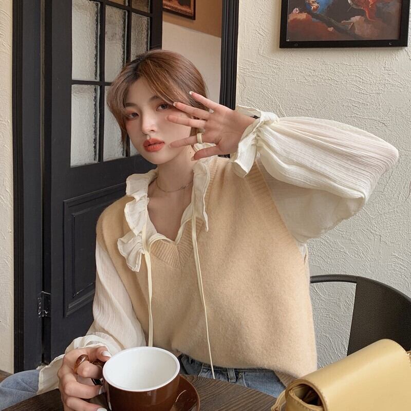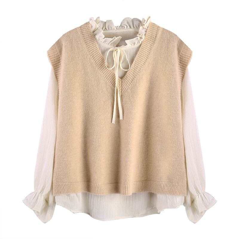 色:アプリコットシフォンシャツ,カーキベストワンピース
