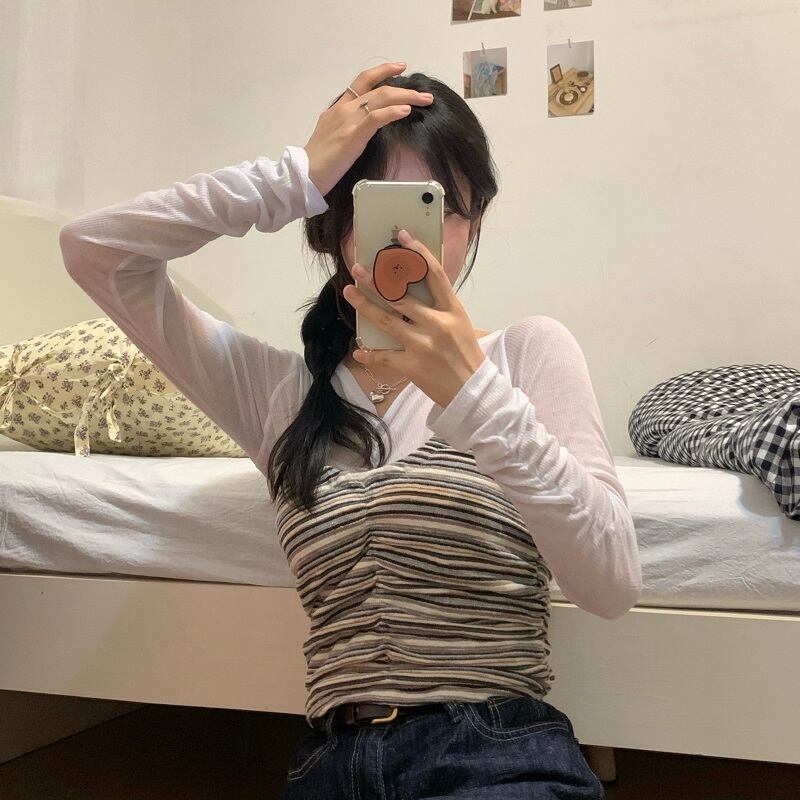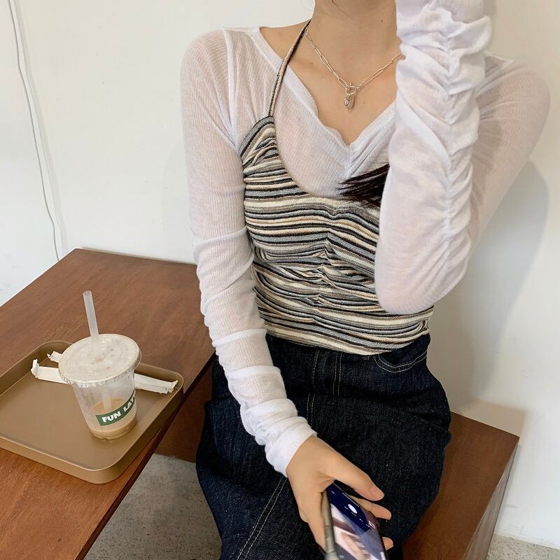 ストライプ夏服スリムショートウェスト ブラウス 夏物 ウエスト MONROE8353524