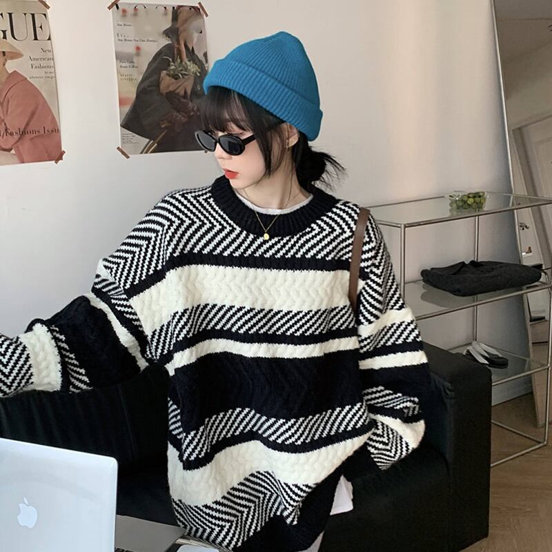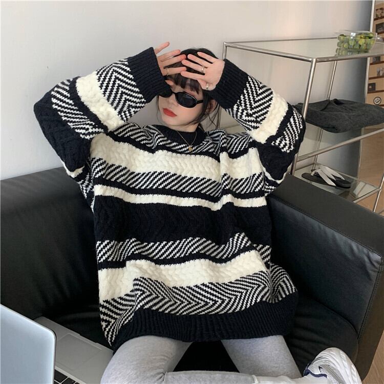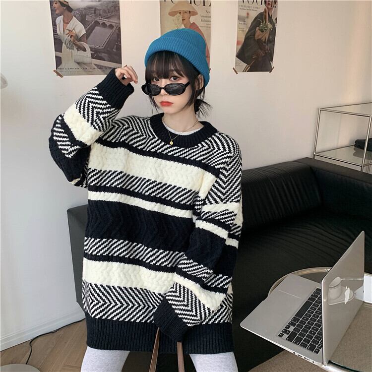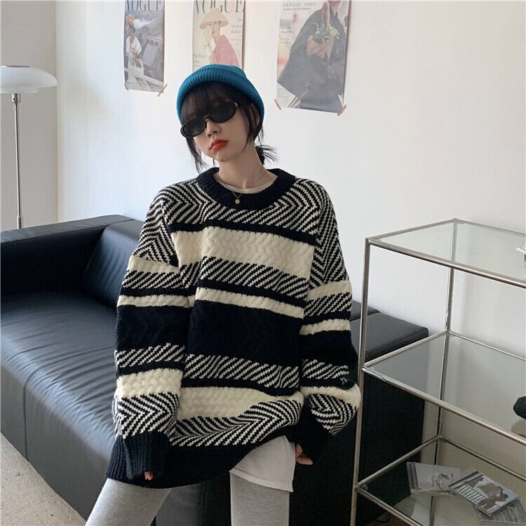 スタンダードストライプセーター スプリング秋物韓国ファッションルーズニットトップス ロング レトロ 春物 オータム スタイル 長袖 SPM8535879896