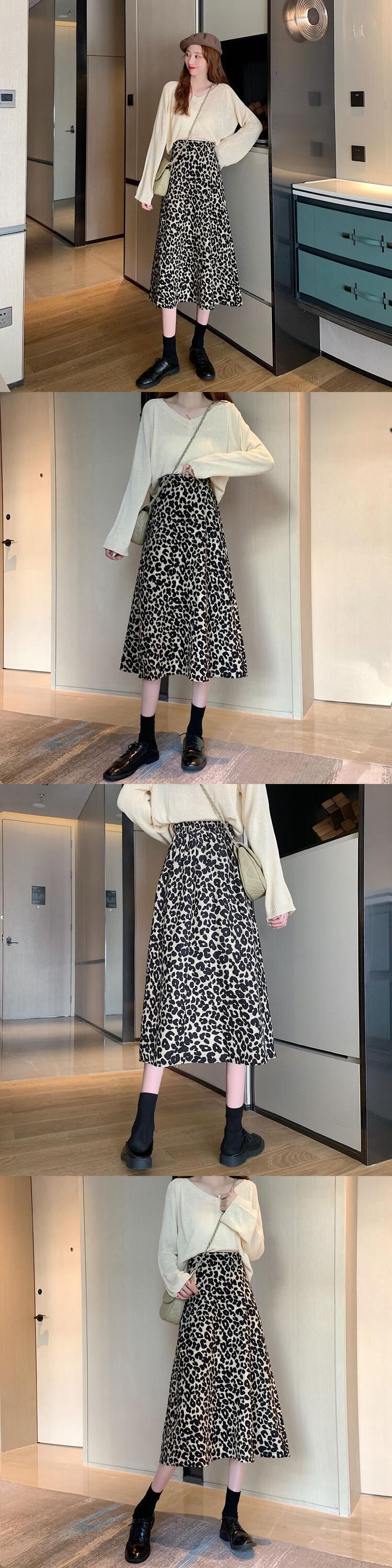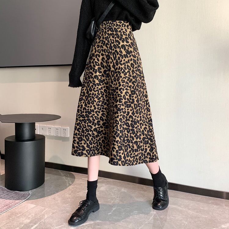 スタンダードレオパードプリント柄スカート レディーススプリング秋物薄手ハイウェストAライン レトロ 春物 オータム ウエスト ミドル丈 SPM3300640415