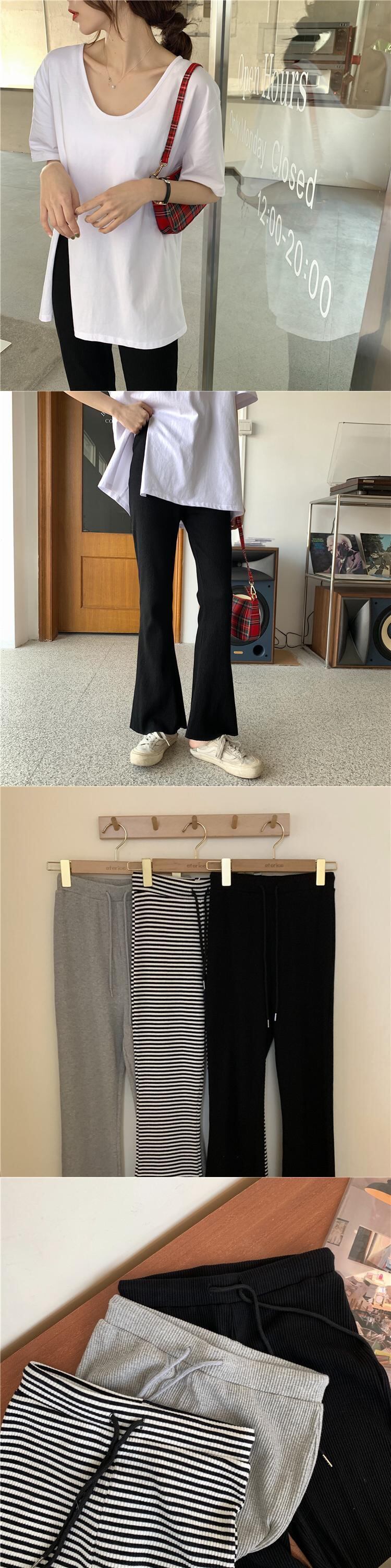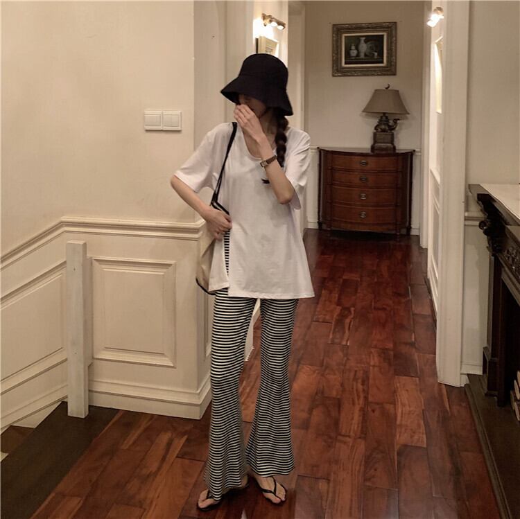 色:ホワイトTシャツシングルピース,黒のTシャツシングルピース,グレーのカジュアルパンツのワンピース,黒いスラックス,ストライプカジュアルパンツ