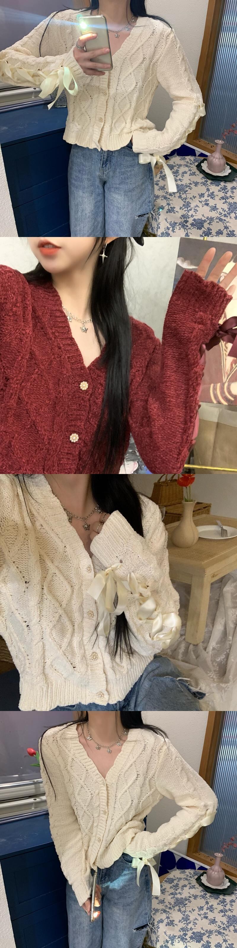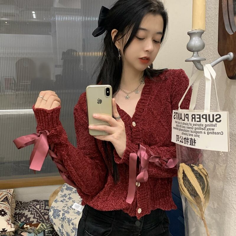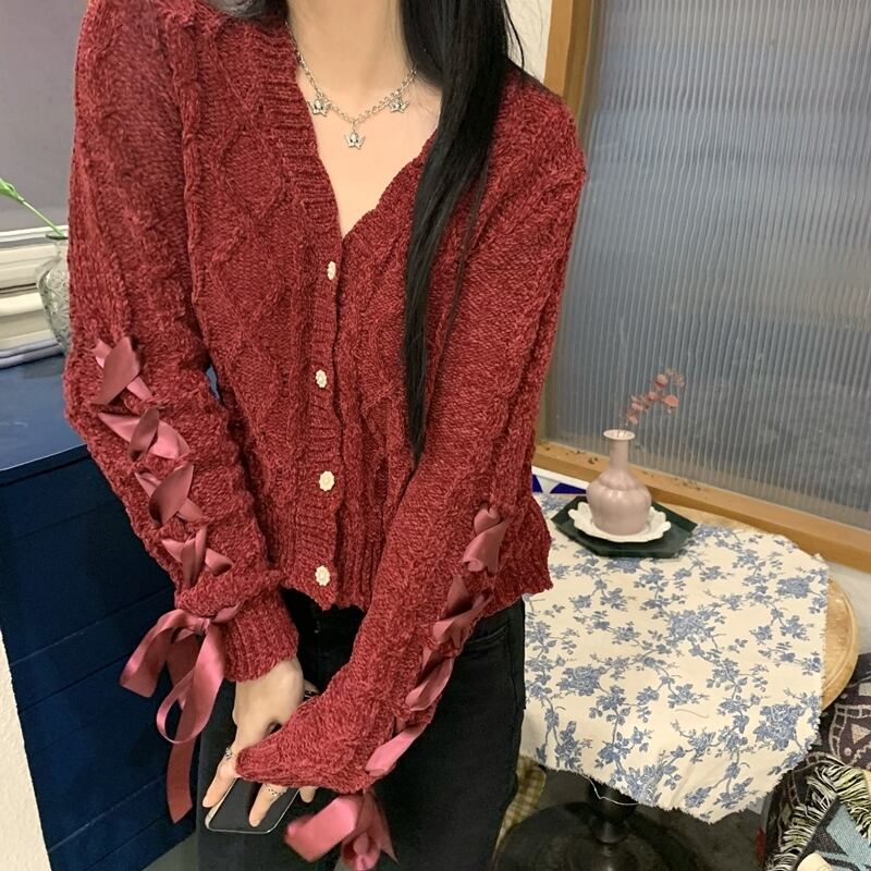 スプリング秋物スタンダードレッドカーディガンセーター ニットトップス リボン レトロ 春物 オータム SPM82577126037