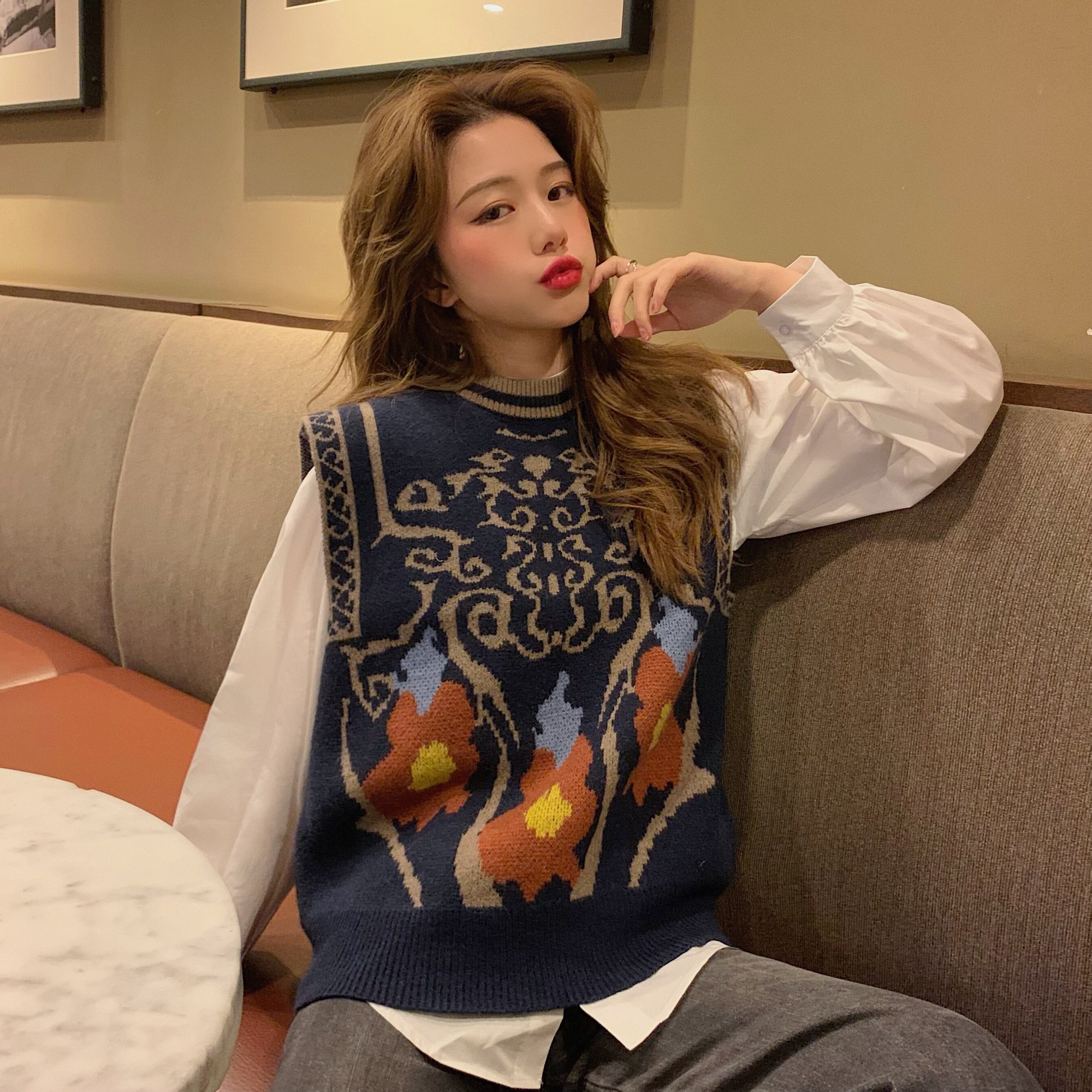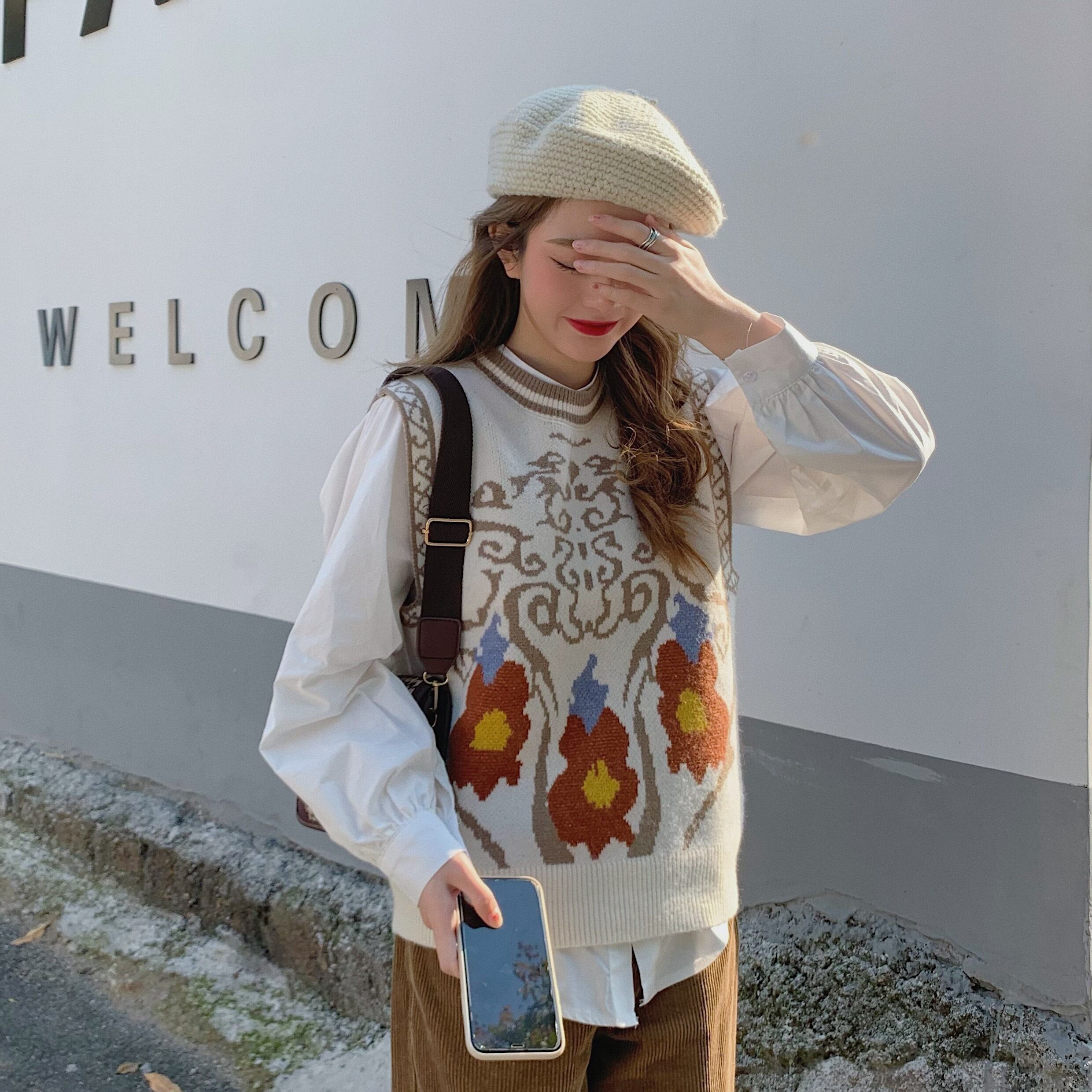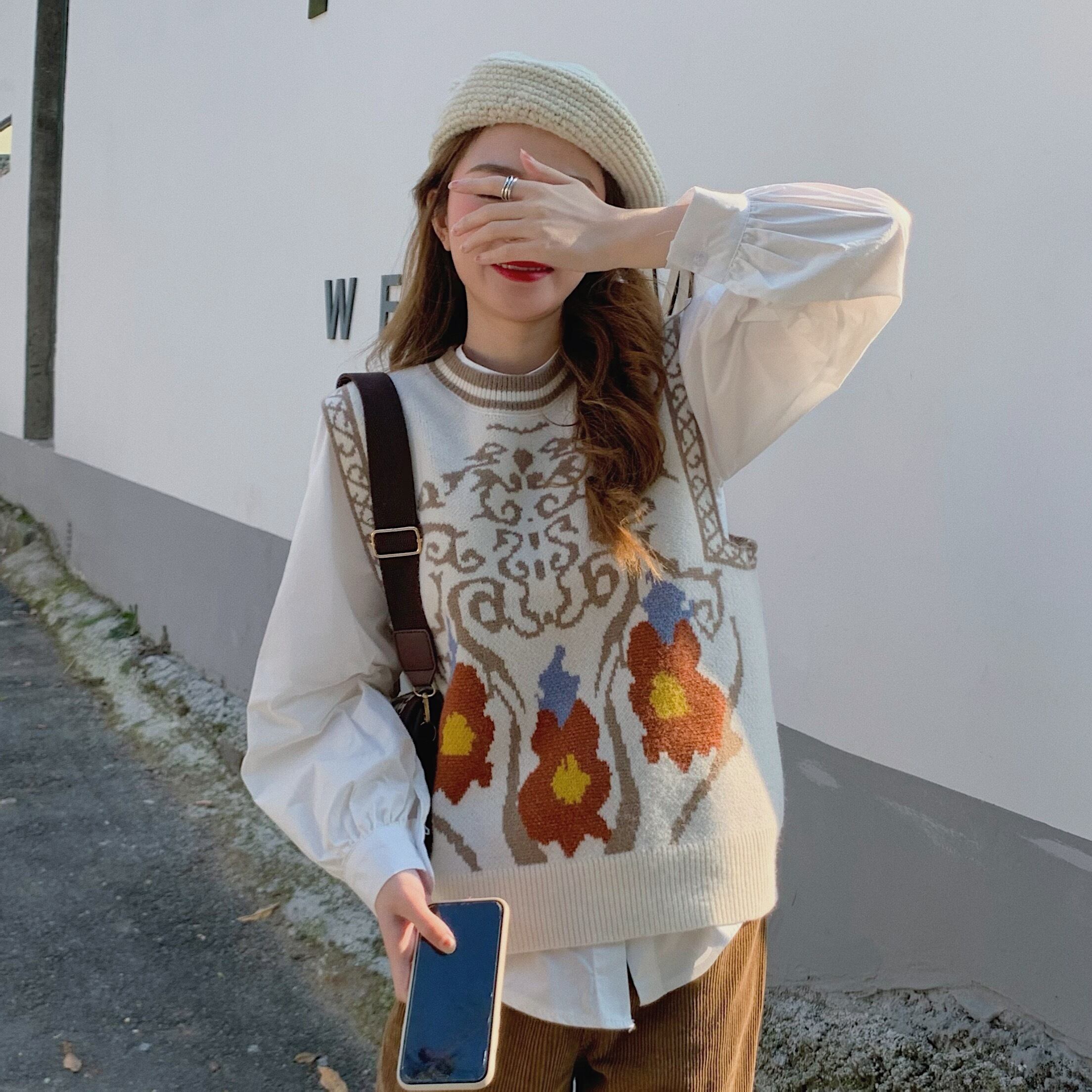 スタンダードノースリーブニットレディーススプリング秋物韓国ファッションルーズジャカード レトロ 春物 オータム ウエスト SPM56573066890