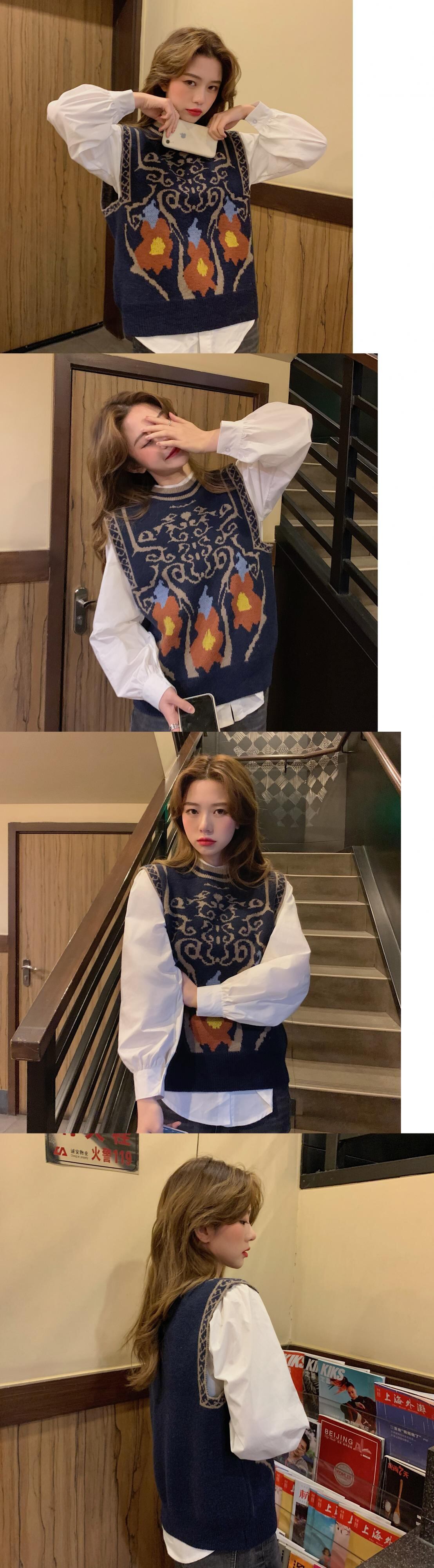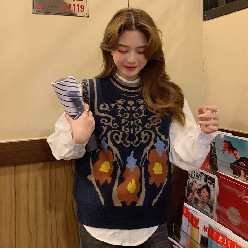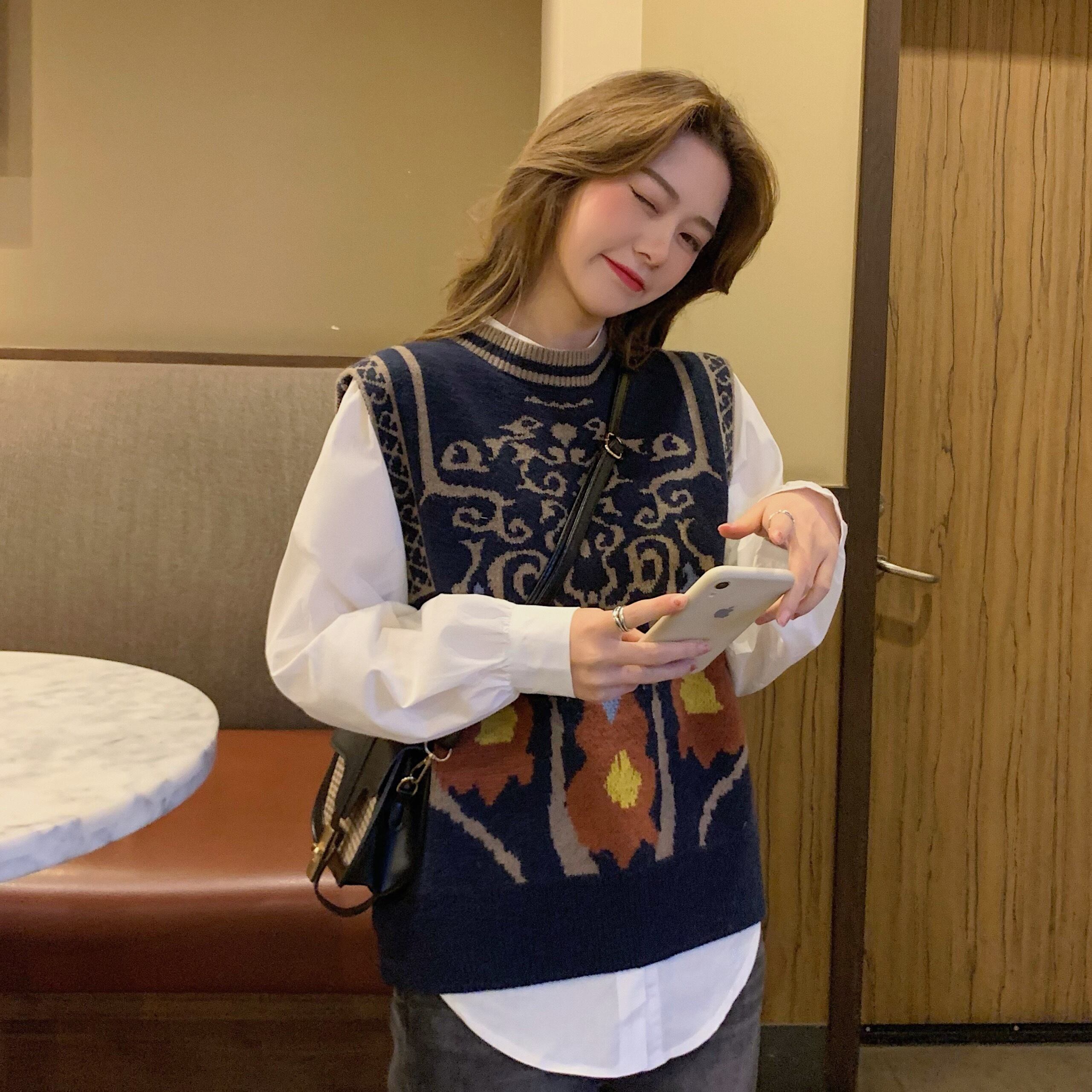スタンダードノースリーブニットレディーススプリング秋物韓国ファッションルーズジャカード レトロ 春物 オータム ウエスト SPM56573066890