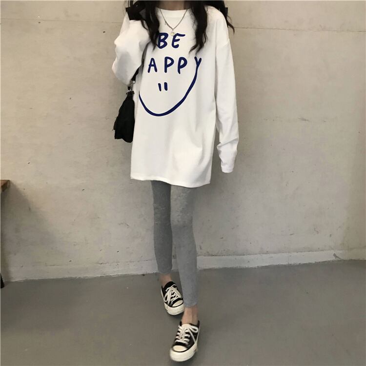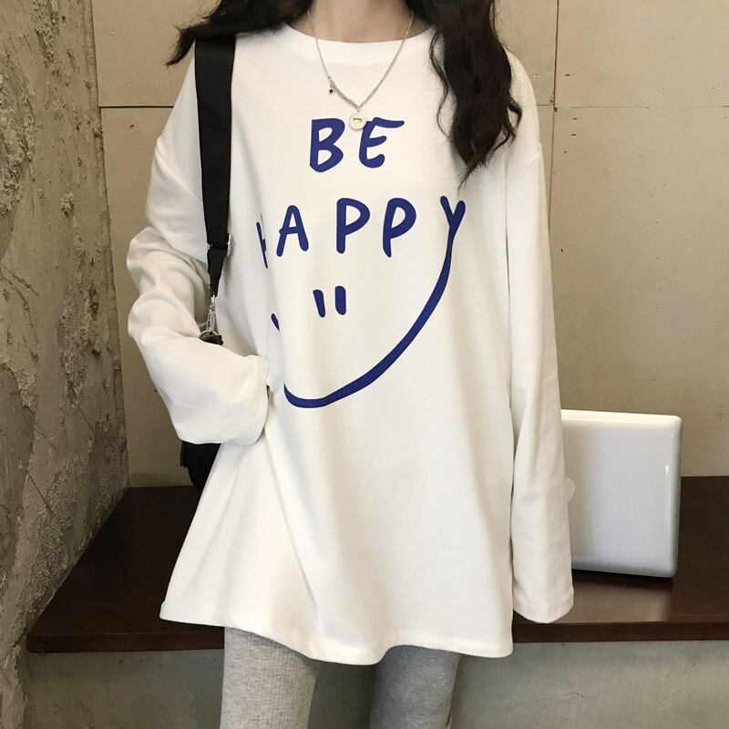 ホワイトTシャツレディーススプリング韓国ファッションルーズプリントゆったりトップス ロング 春物 スタイル 長袖 ミドル丈 SPM66804222115