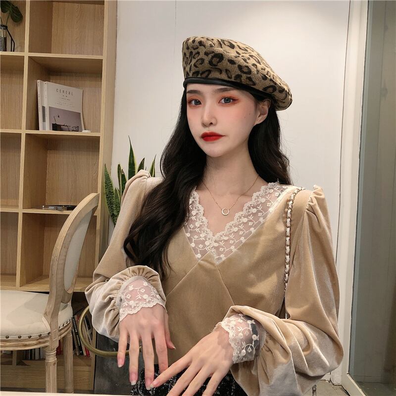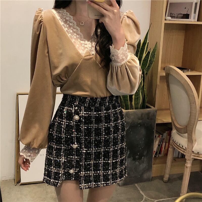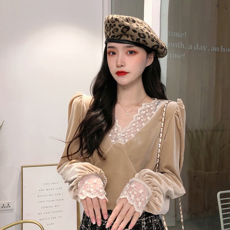 スタンダード厚みブラウス スプリング韓国ファッションVネックレースシャツ レディース ロング レトロ 春物 ステッチ 長袖 SPM18861372145
