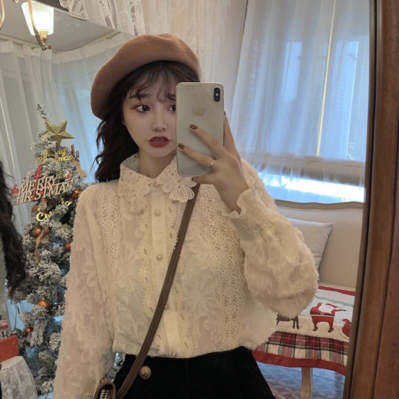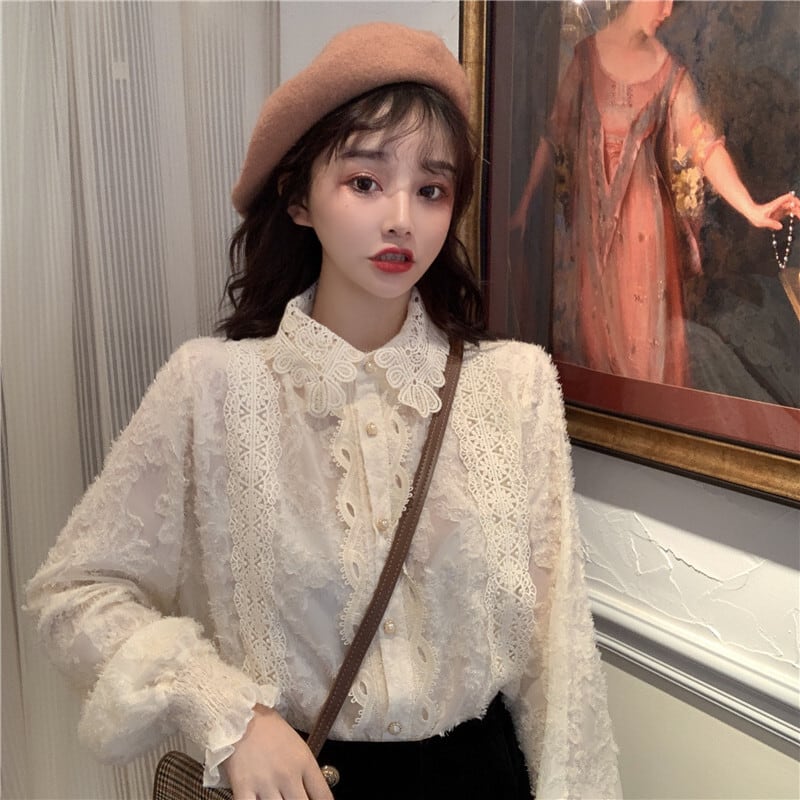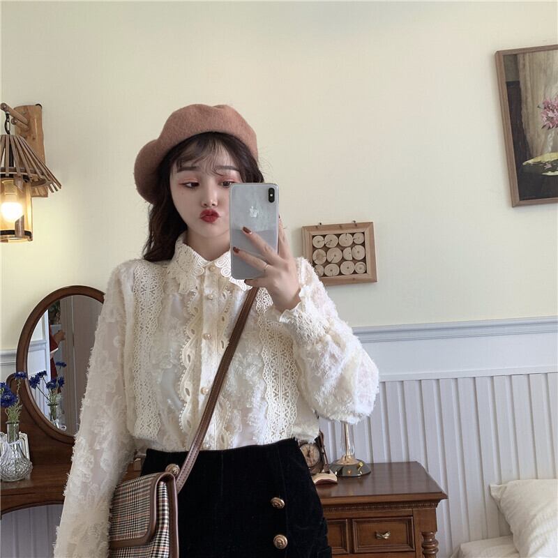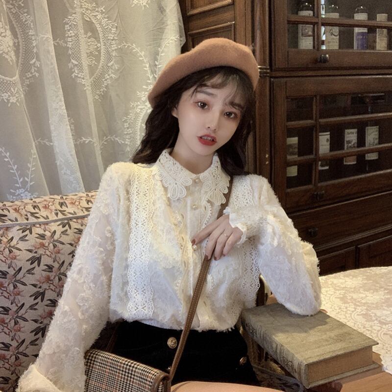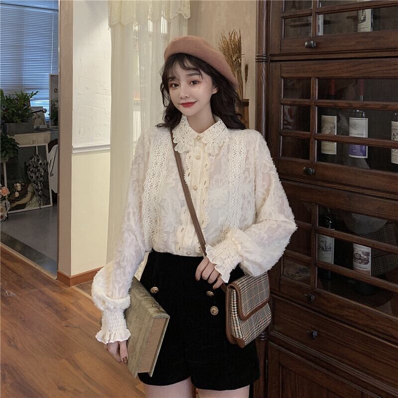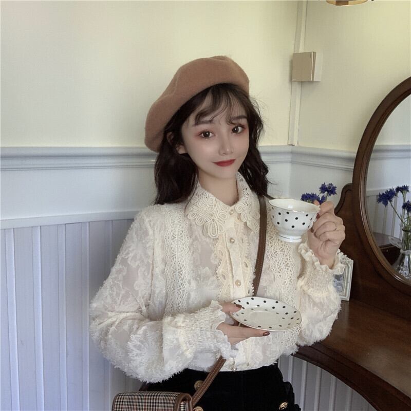 ゆったりシャツ トップス スプリング韓国ファッションスタイルベージュレースレディース ロング 春物 長袖 SPM10575335071