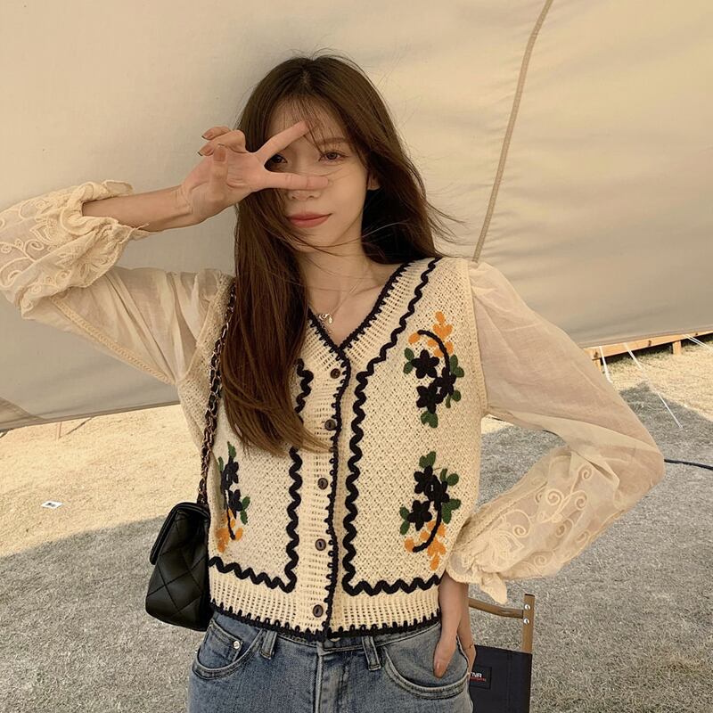 Vネックセーター レディーススプリングスタイルショートトップス 秋物カーディガンジャケット ロング レッド 刺繍 春物 オータム 長袖 SPM67804567739