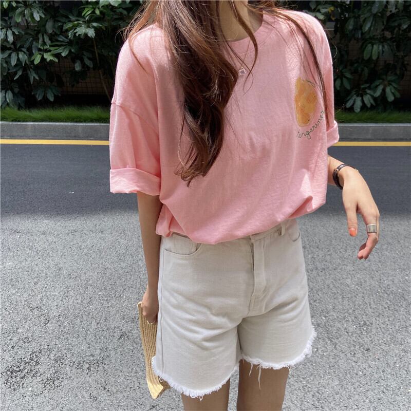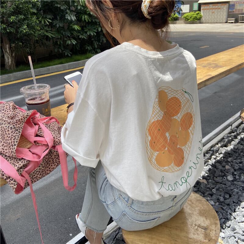 トレンドオレンジプリント柄Tシャツシャツ レディース夏服韓国ファッションルーズカジュアルホワイトゆったり 夏物 SPM73609097006