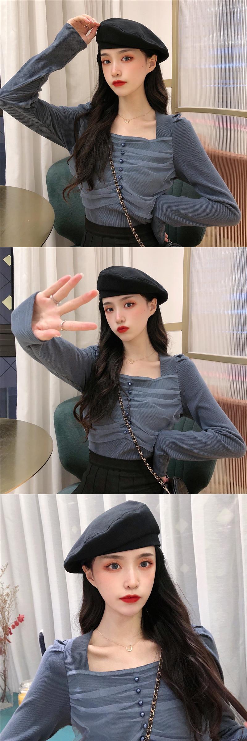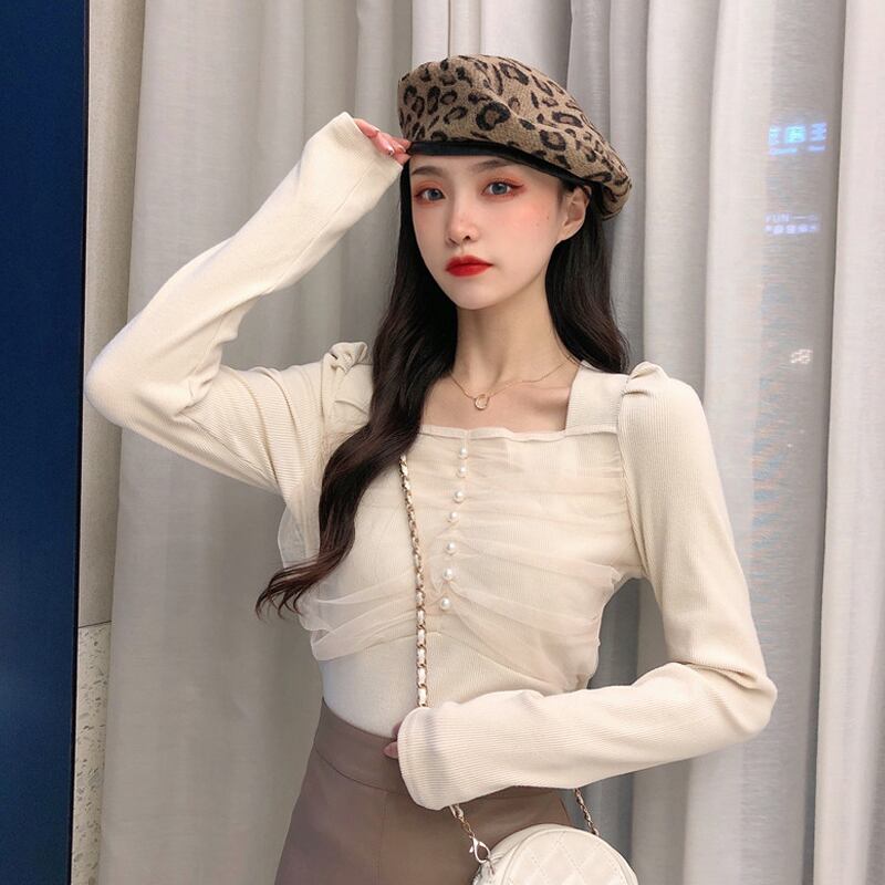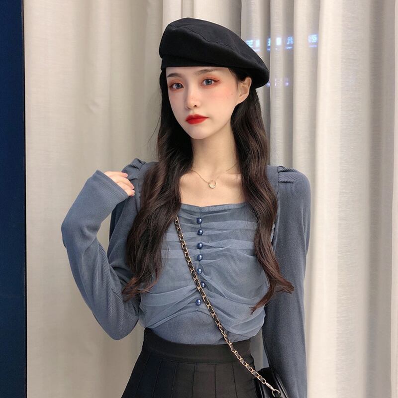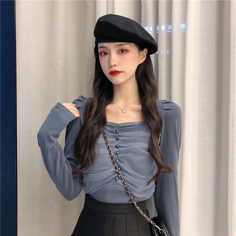 スプリングメッシュゆったりシャツ トップス 韓国ファッションスタイルTシャツレディース ロング 春物 スクウェア ステッチ 長袖 SPM72647026217