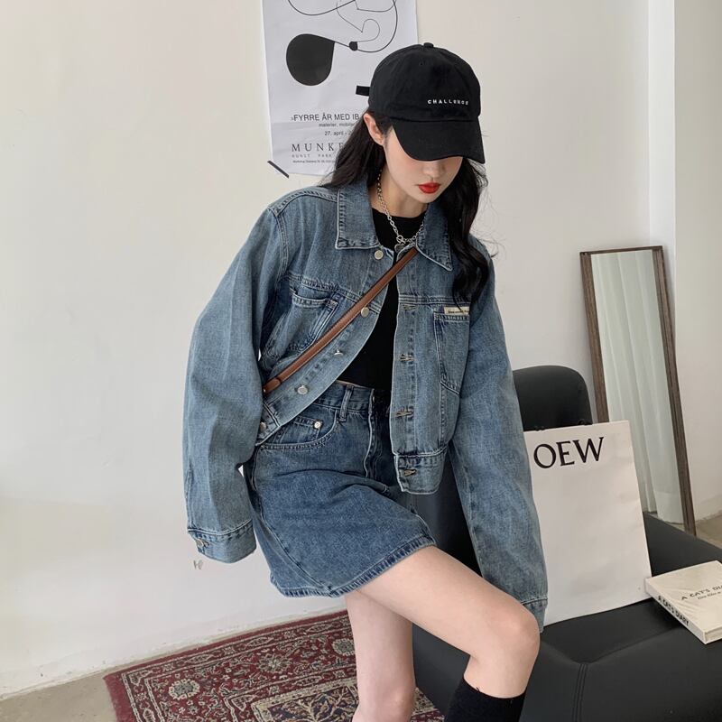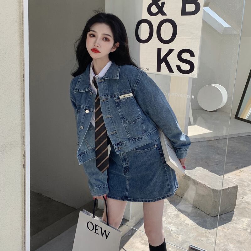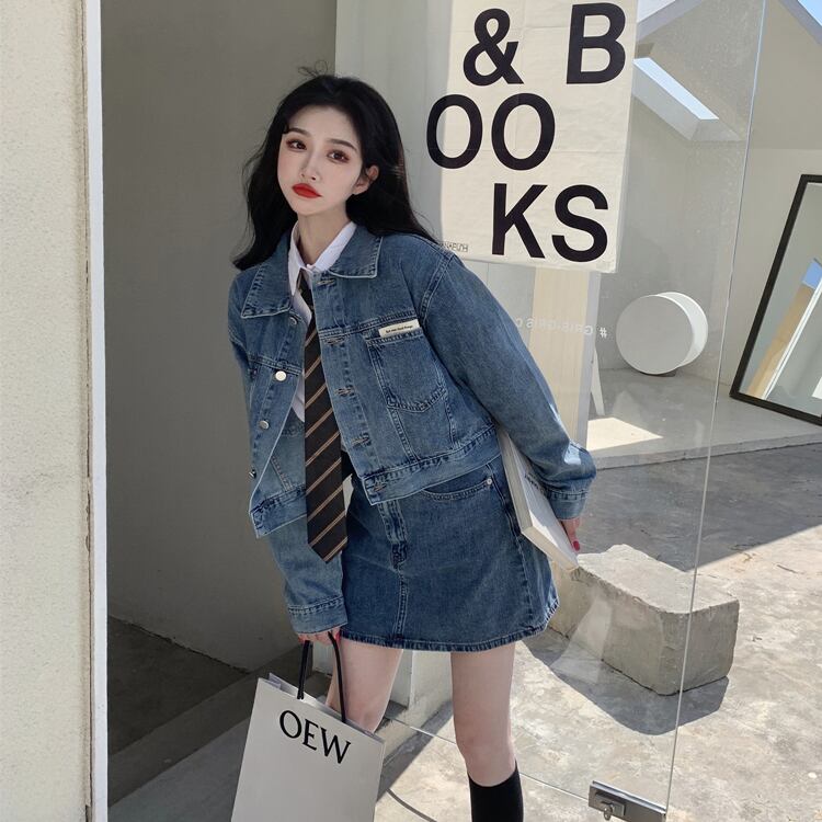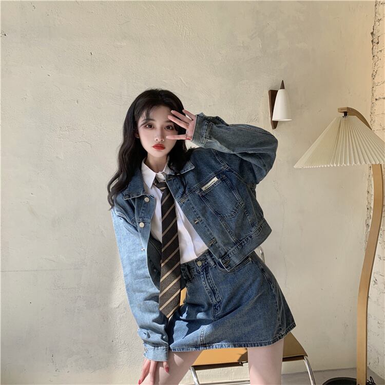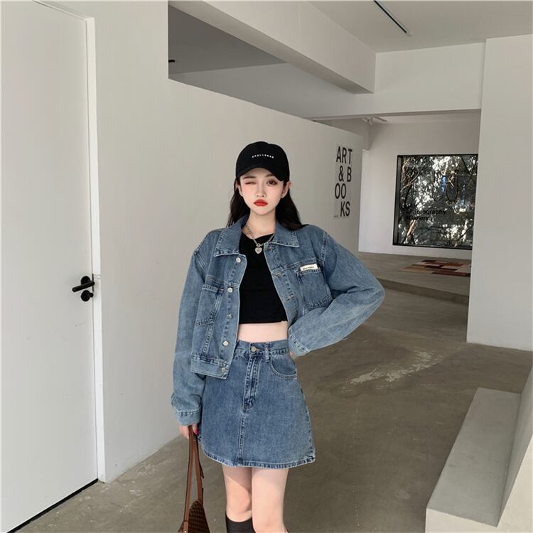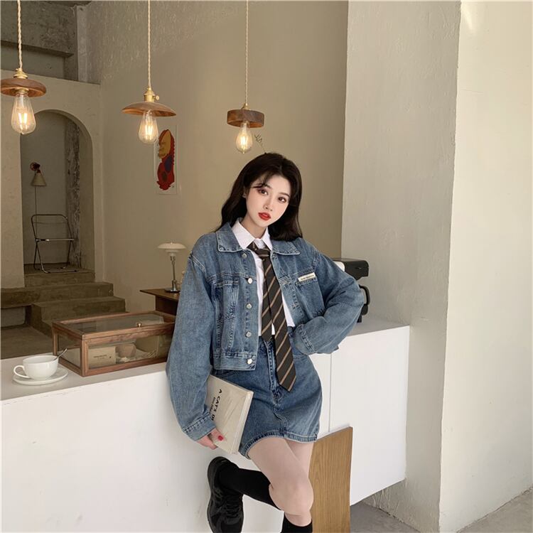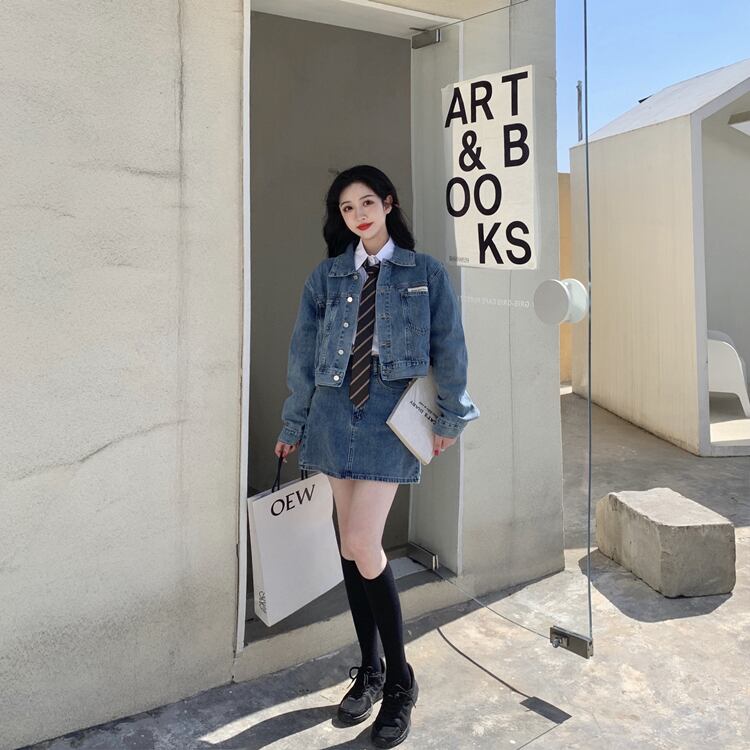 色:デニムジャケットワンピース,デニムスカートシングル,白のシャツ,ジャケット+スカート