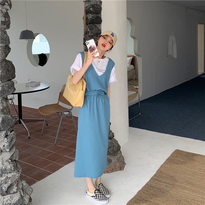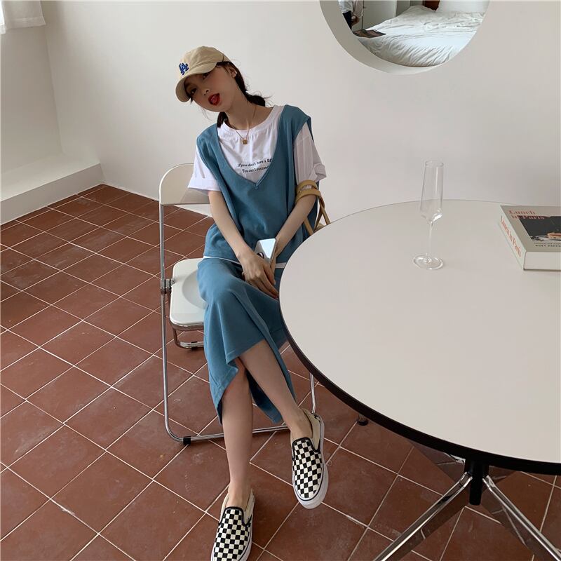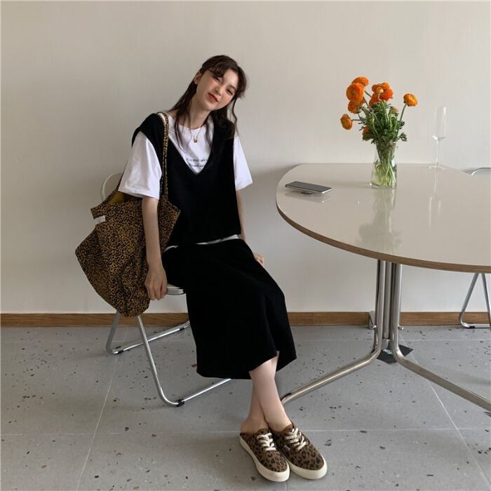 色:ホワイトレターTシャツ,ミストブルーベスト+ハーフスカート,グレーベスト+ハーフスカート,ブラックベスト+ハーフスカート