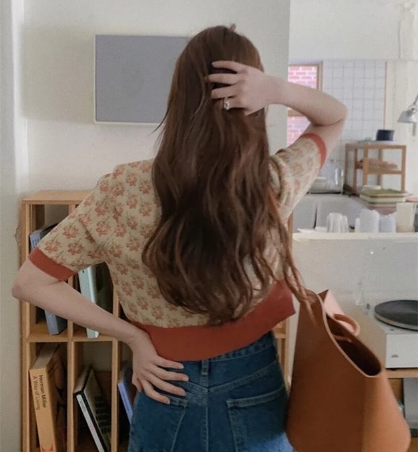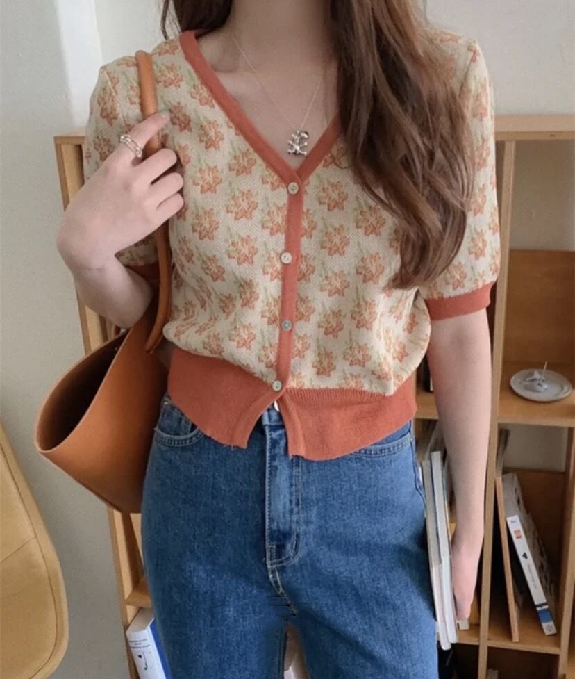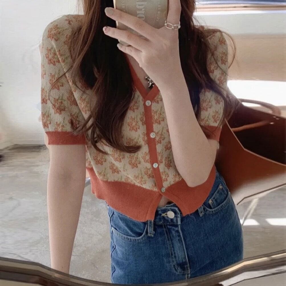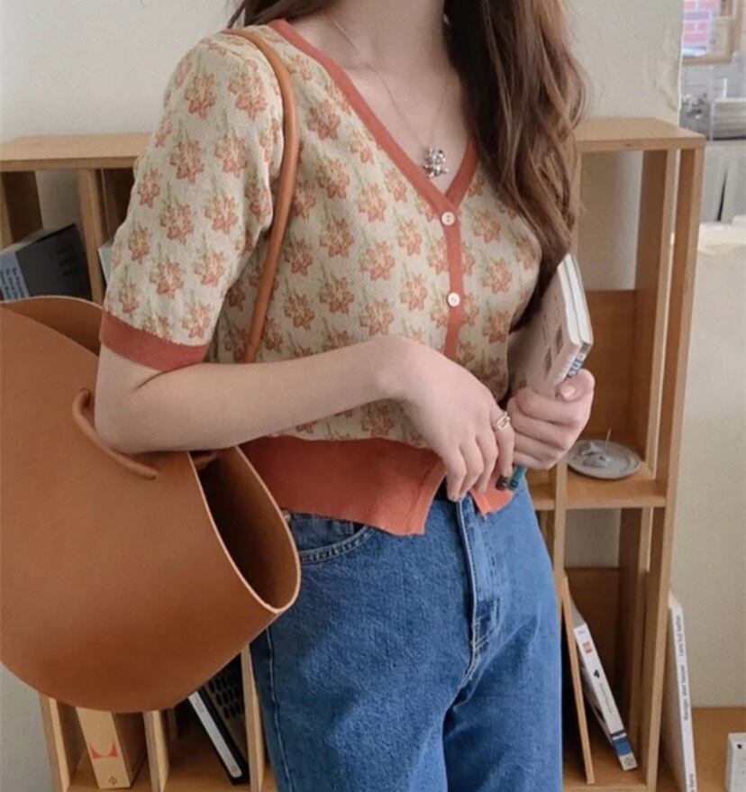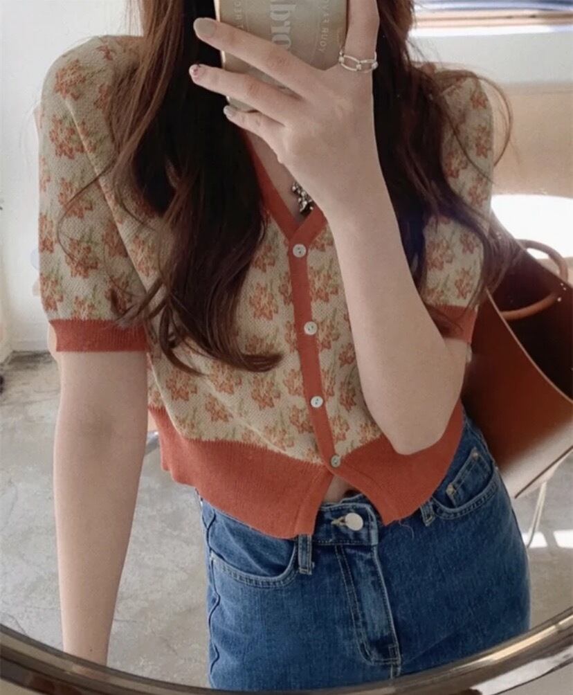 スタンダードVネックショートニットカーディガンジャケット 薄手夏服スタイルフローラルトップス レトロ 大人ガーリー スウィート キュート カジュアル 夏物 花柄 MONROE76484011481