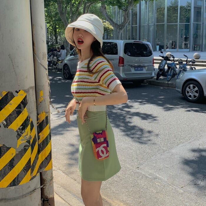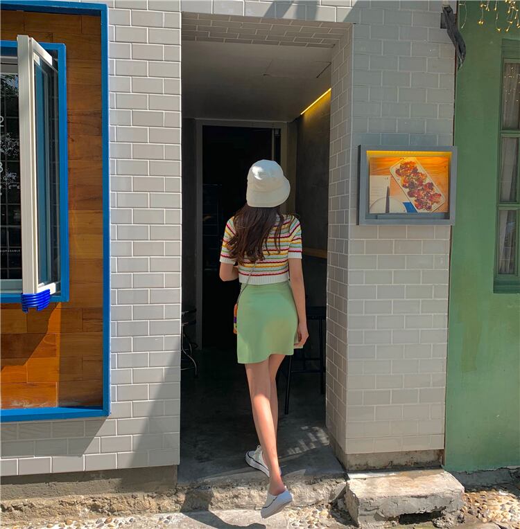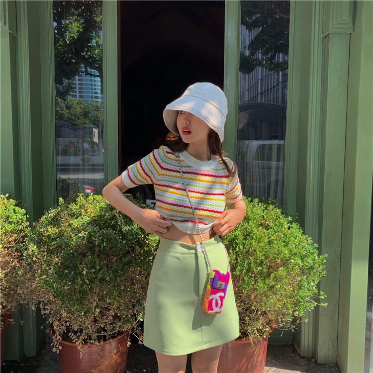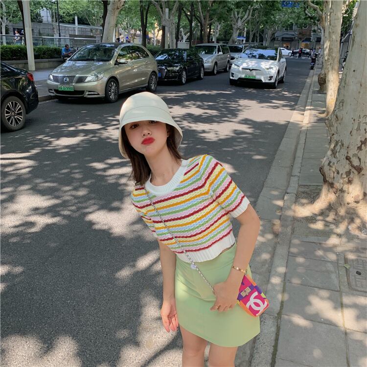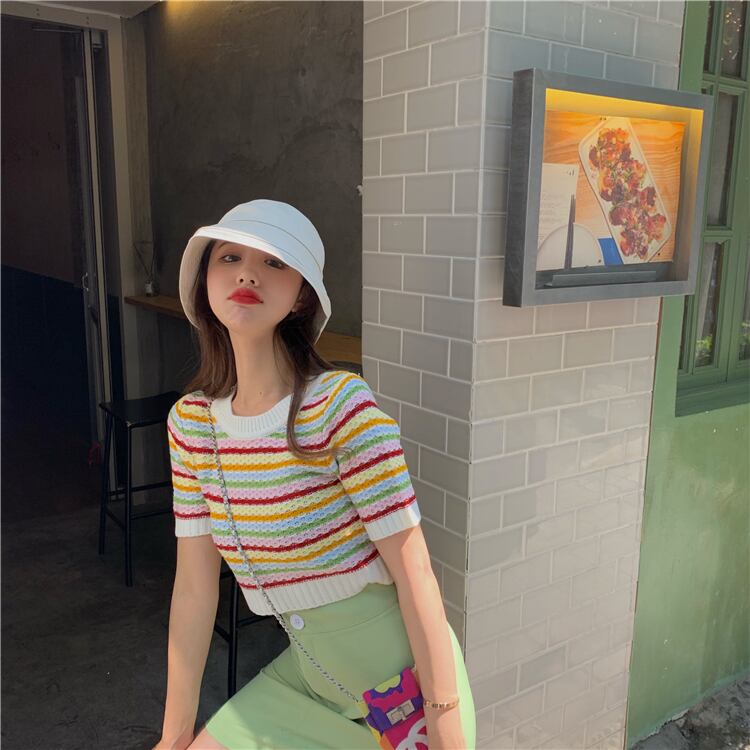 ストライプニットTシャツレディース韓国ファッションスタイルショート夏服ハイウェストクロップドトップス 夏物 ウエスト MONROE96346898648