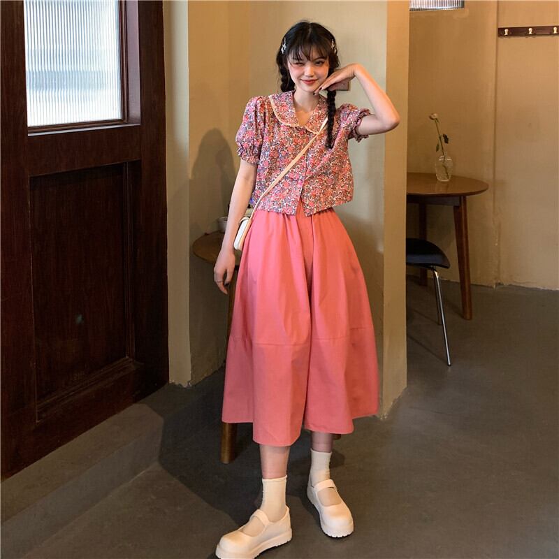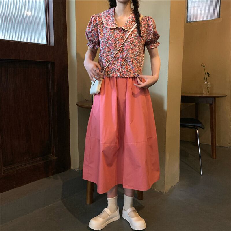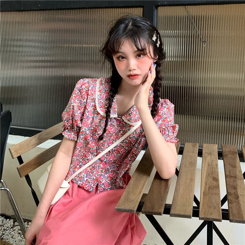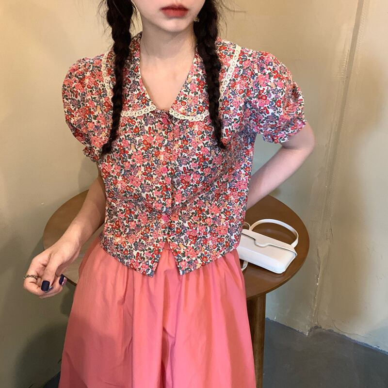 カラーフローラルシャツ レディーススタンダードショート夏服スリーブトップス レトロ 夏物 花柄 SYJ85047845993