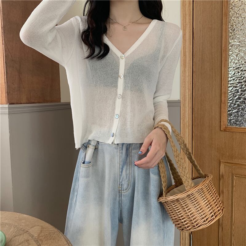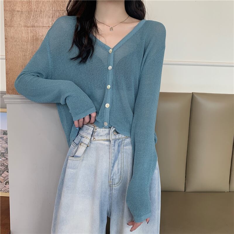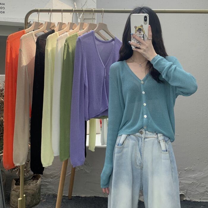 韓国ファッションルーズ薄手ソリッド カラーVネックセーター スプリング夏服スリムカーディガン ロング 春物 夏物 ソリッドカラー スタイル 長袖 ワンナンバー37892781892