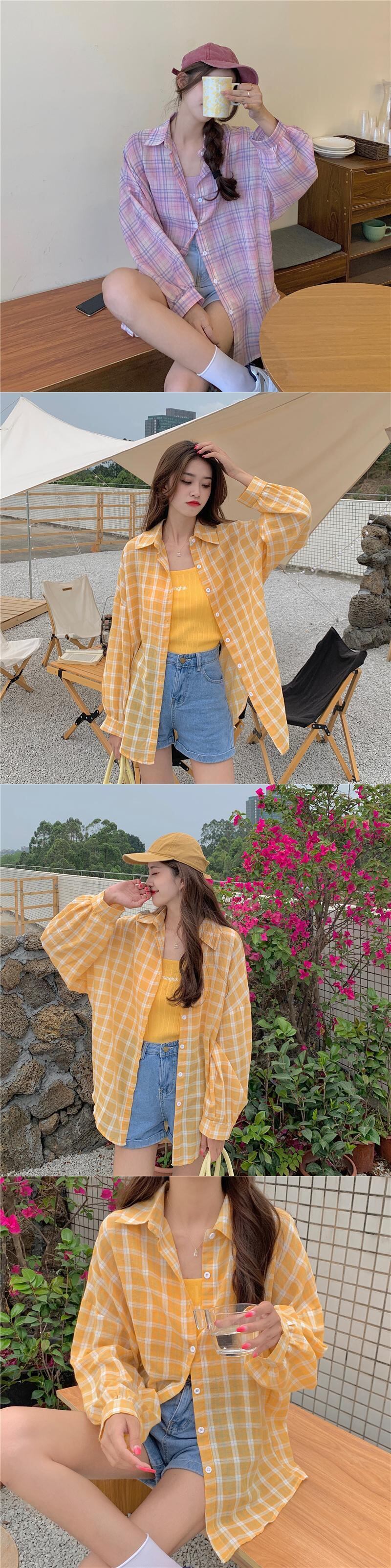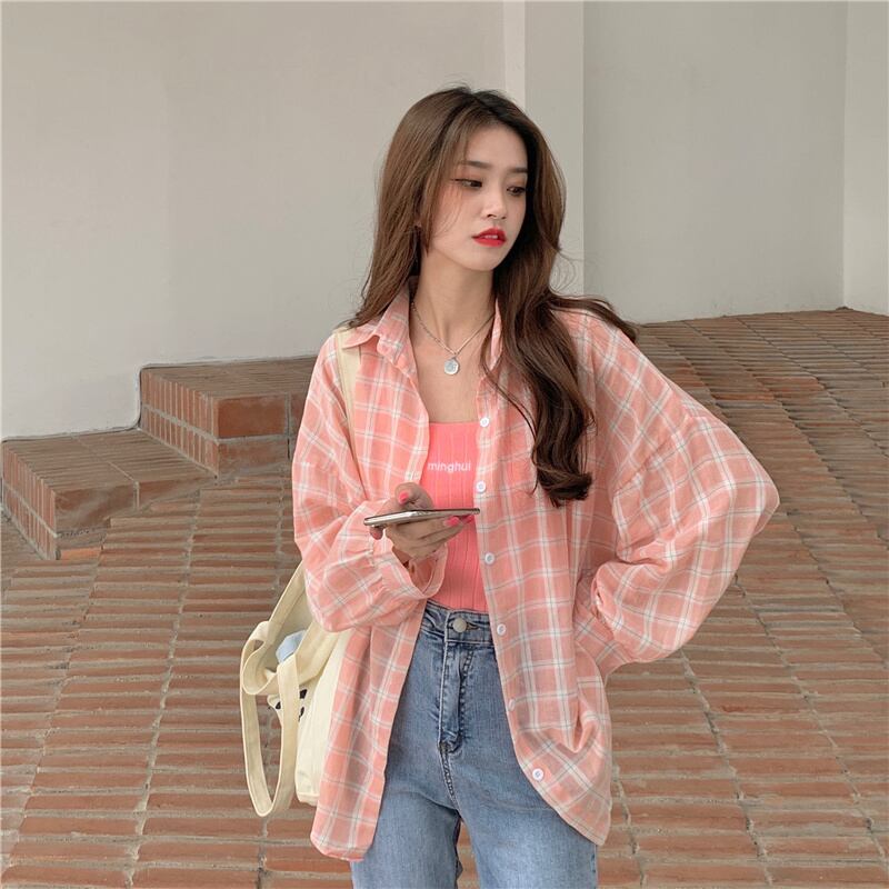 スプリング秋物韓国ファッション薄手シャツ 格子柄トップス レディース ロング 春物 オータム スタイル 長袖 YY35331456469
