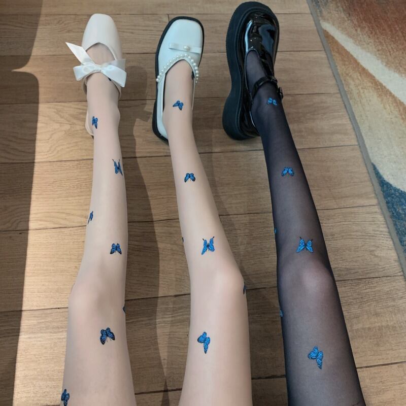 スプリング夏服薄手ブルーButterflyデザイン プリント柄ストッキング レースゆったりレディース 春物 夏物 タイツ ソックス シルク YY55014964156