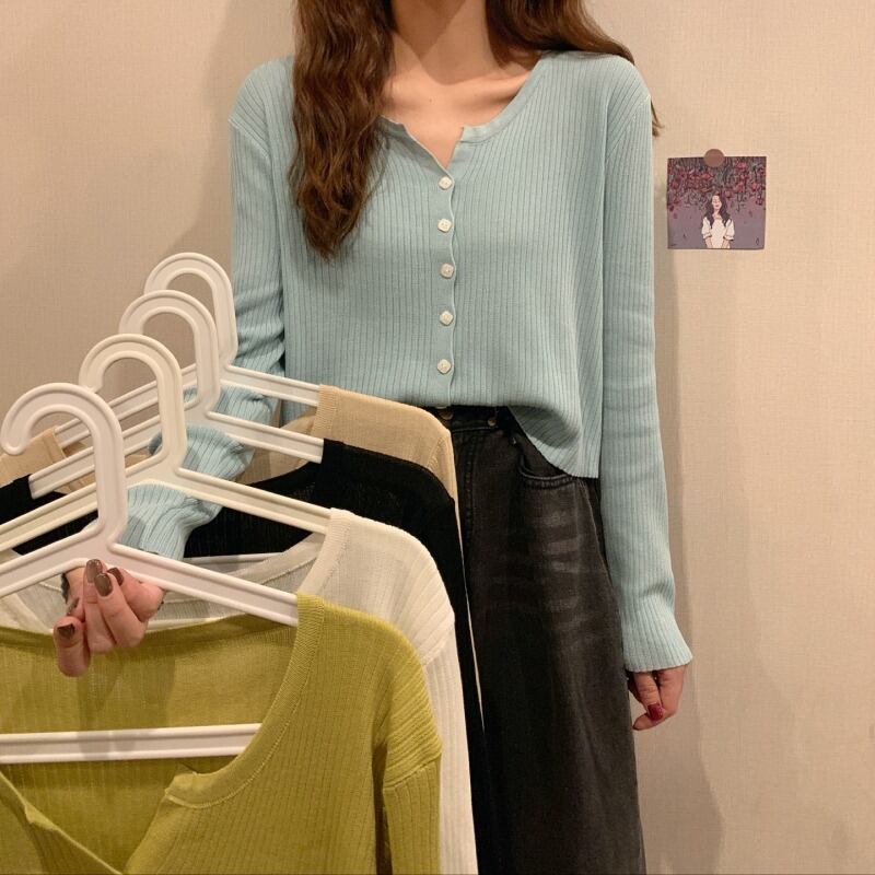 スプリング秋物韓国ファッションルーズ薄手ニットカーディガンシャツ ソリッド カラーショートゆったり ロング 春物 オータム ソリッドカラー スタイル 長袖 YY75929668418