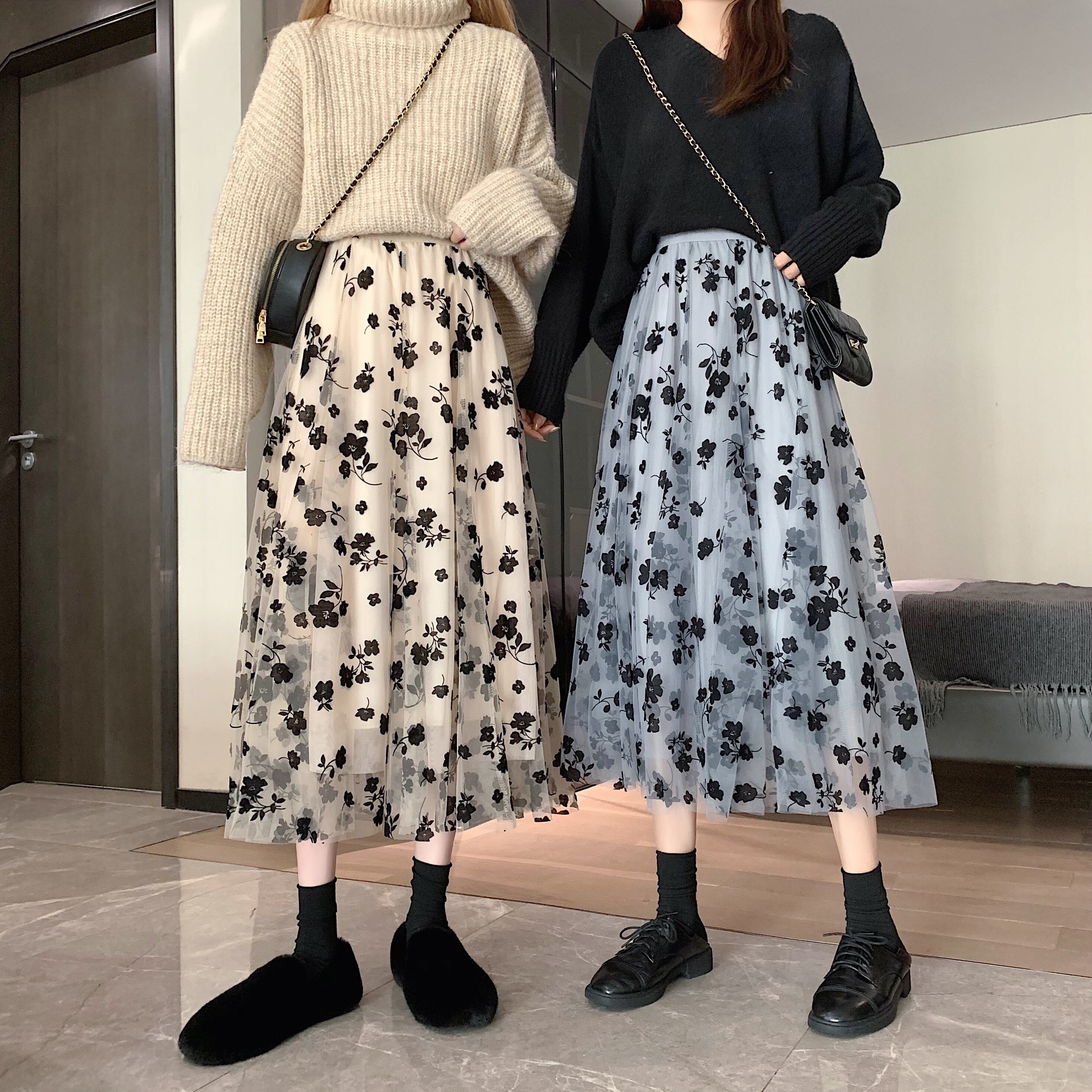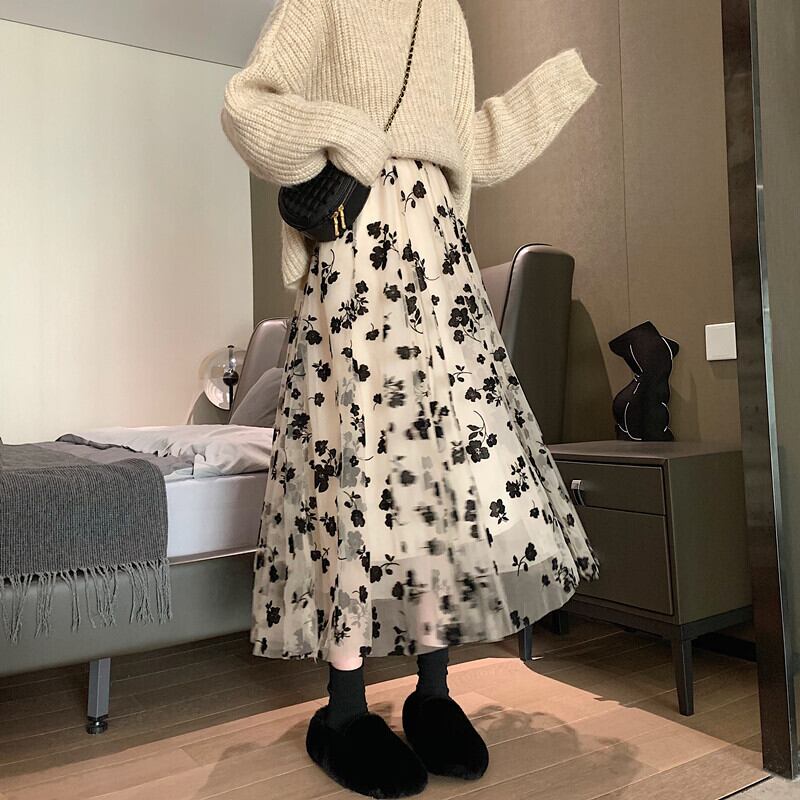メッシュフローラルスカート ウィンターセーター レディースハイウェスト薄手Aライン 冬物 花柄 ウエスト ミドル丈 ワンナンバー56892865147