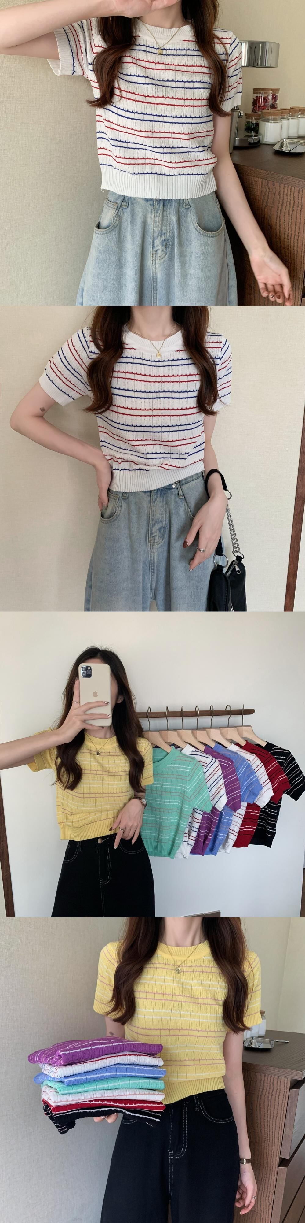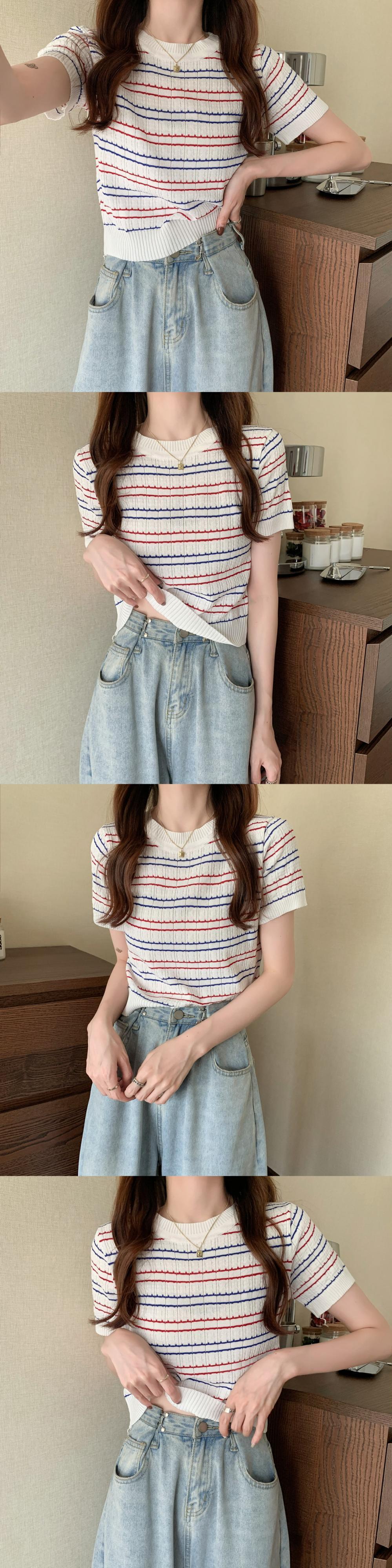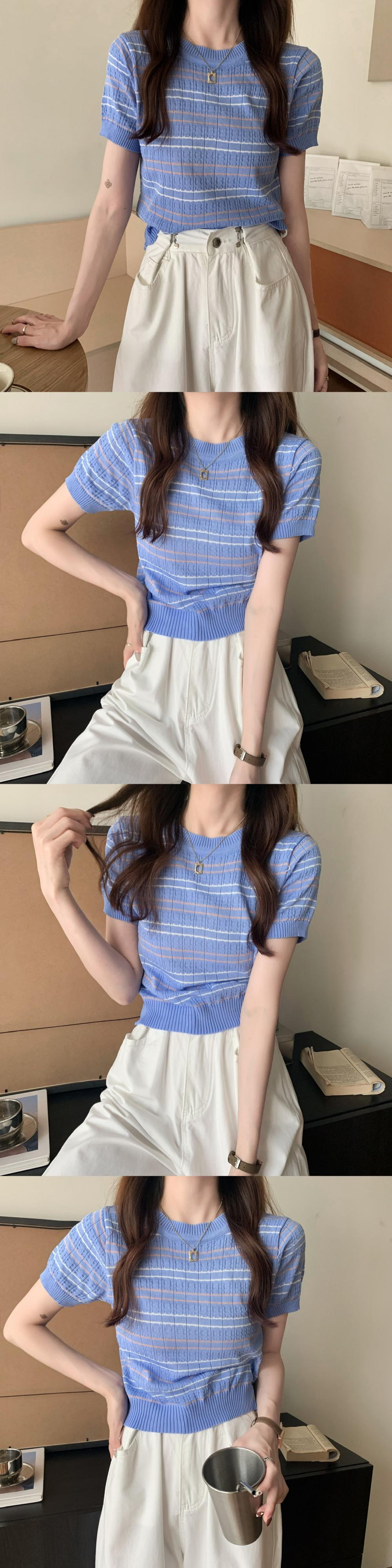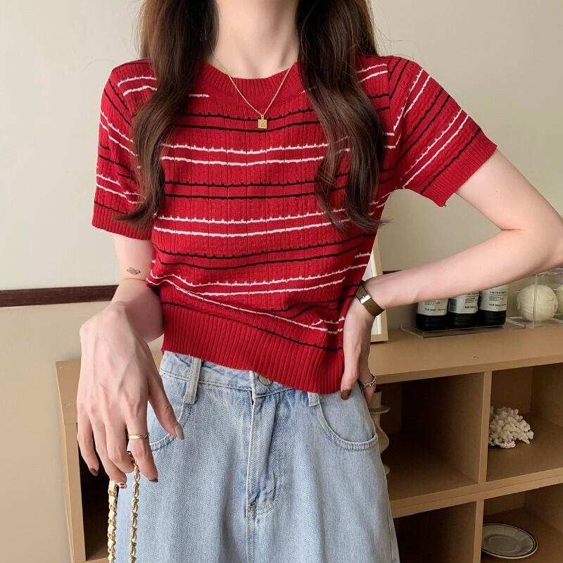 夏服韓国ファッションルーズショートストライプジャケット 薄手ニットTシャツレディーストレンド 夏物 スタイル YY77234077519