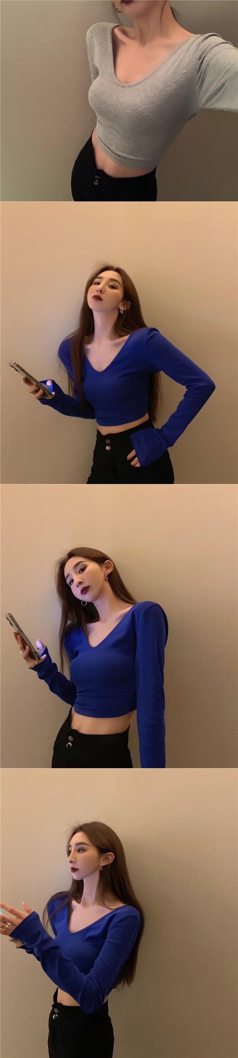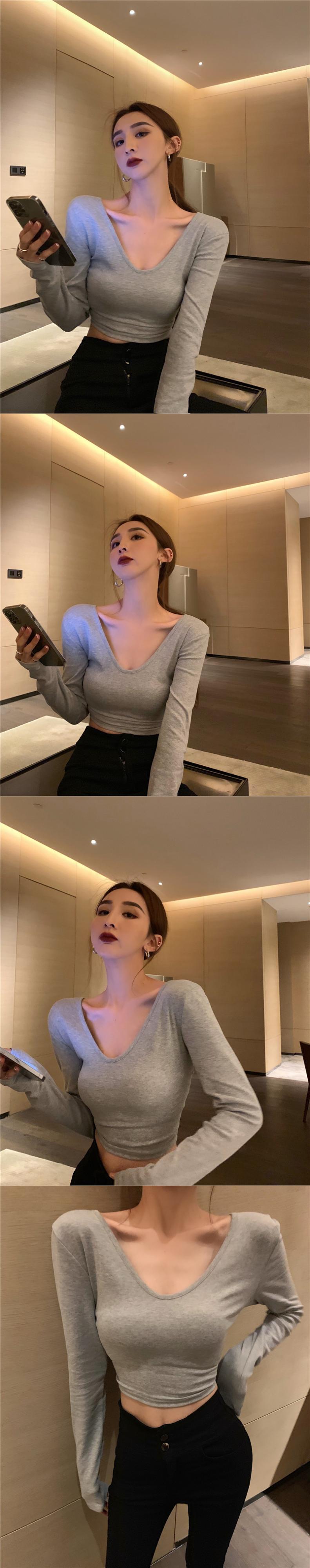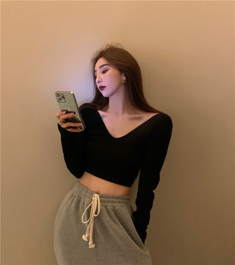 ショートトップス レディーススタイルスプリング薄手VネックブラックTシャツシャツ ゆったり ロング 春物 ヨーロピアン 長袖 YY69922134720