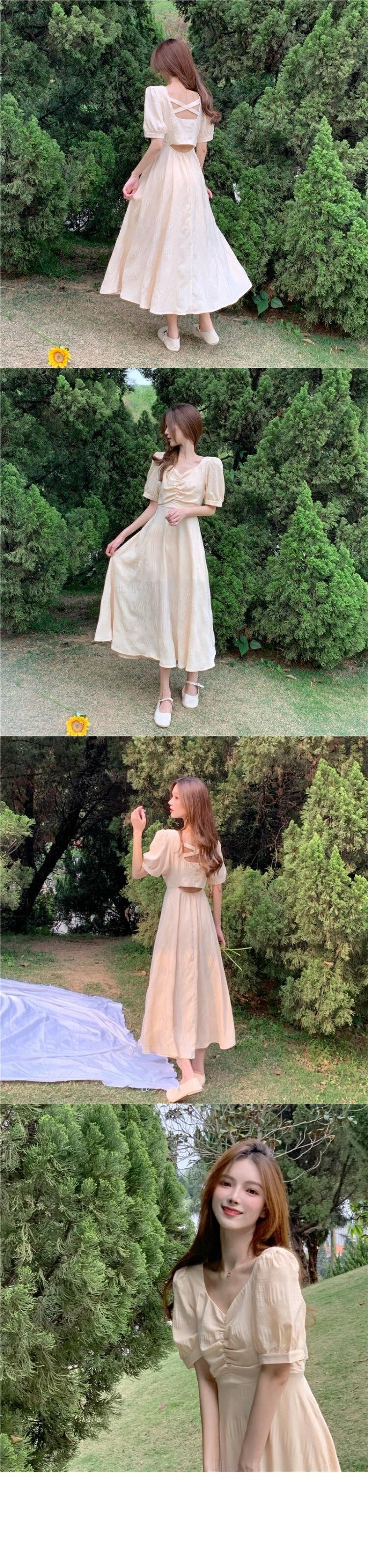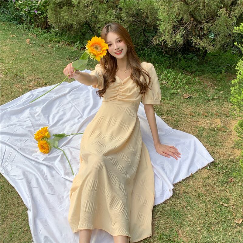 ワンピース夏服スタイルVネックイエローバックAラインスカート 夏物 ミドル丈 YY29074444666