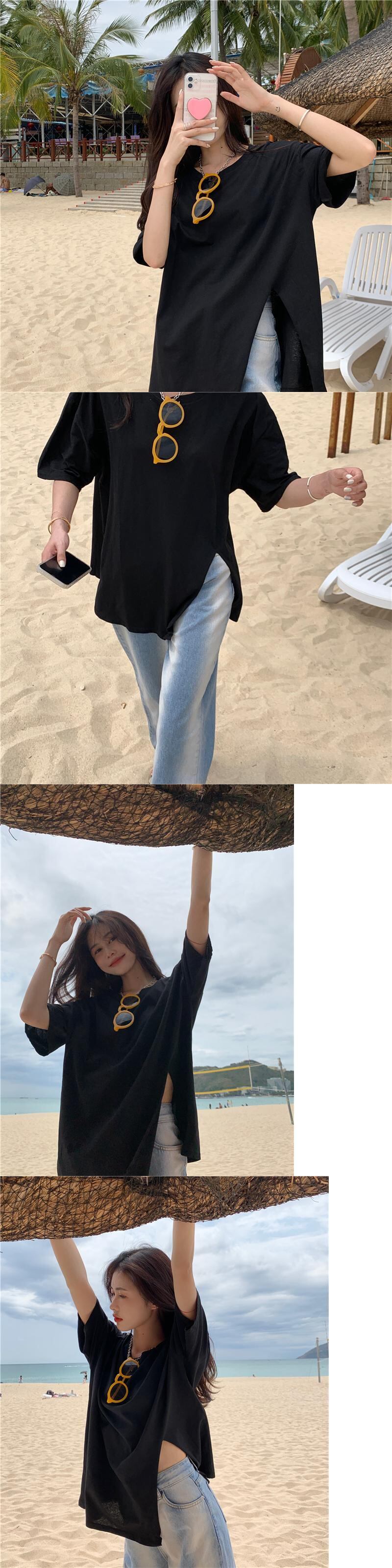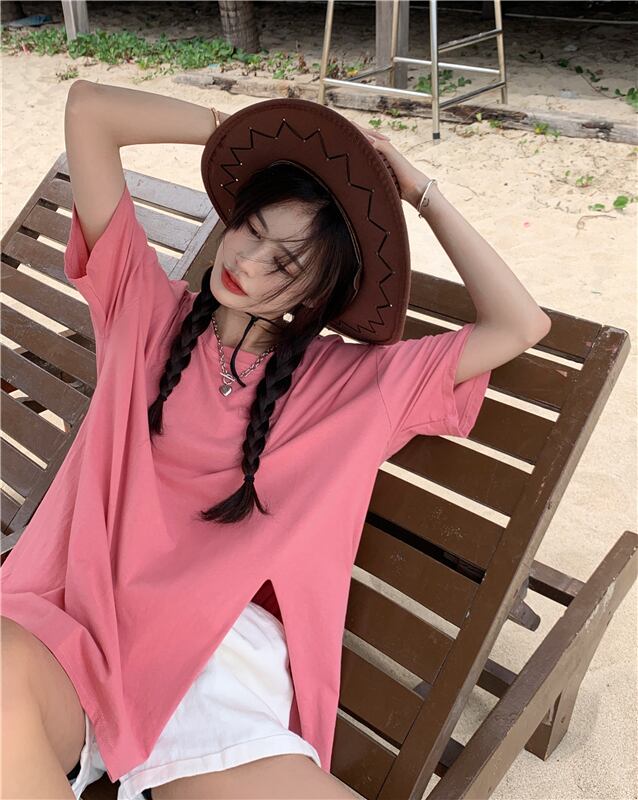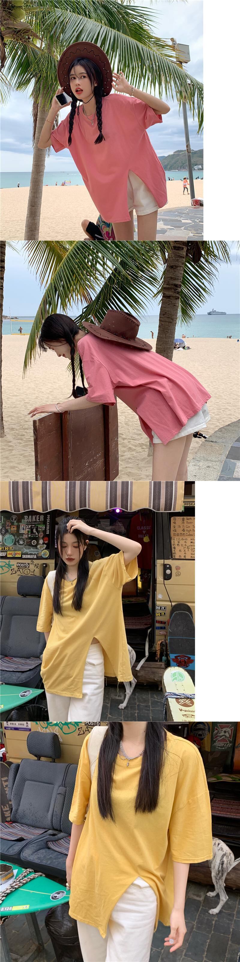 スリットTシャツシャツ 夏服ルーズ韓国ファッションロングスタイルソリッド カラーゆったりトップス 夏物 ソリッドカラー YY6439447056