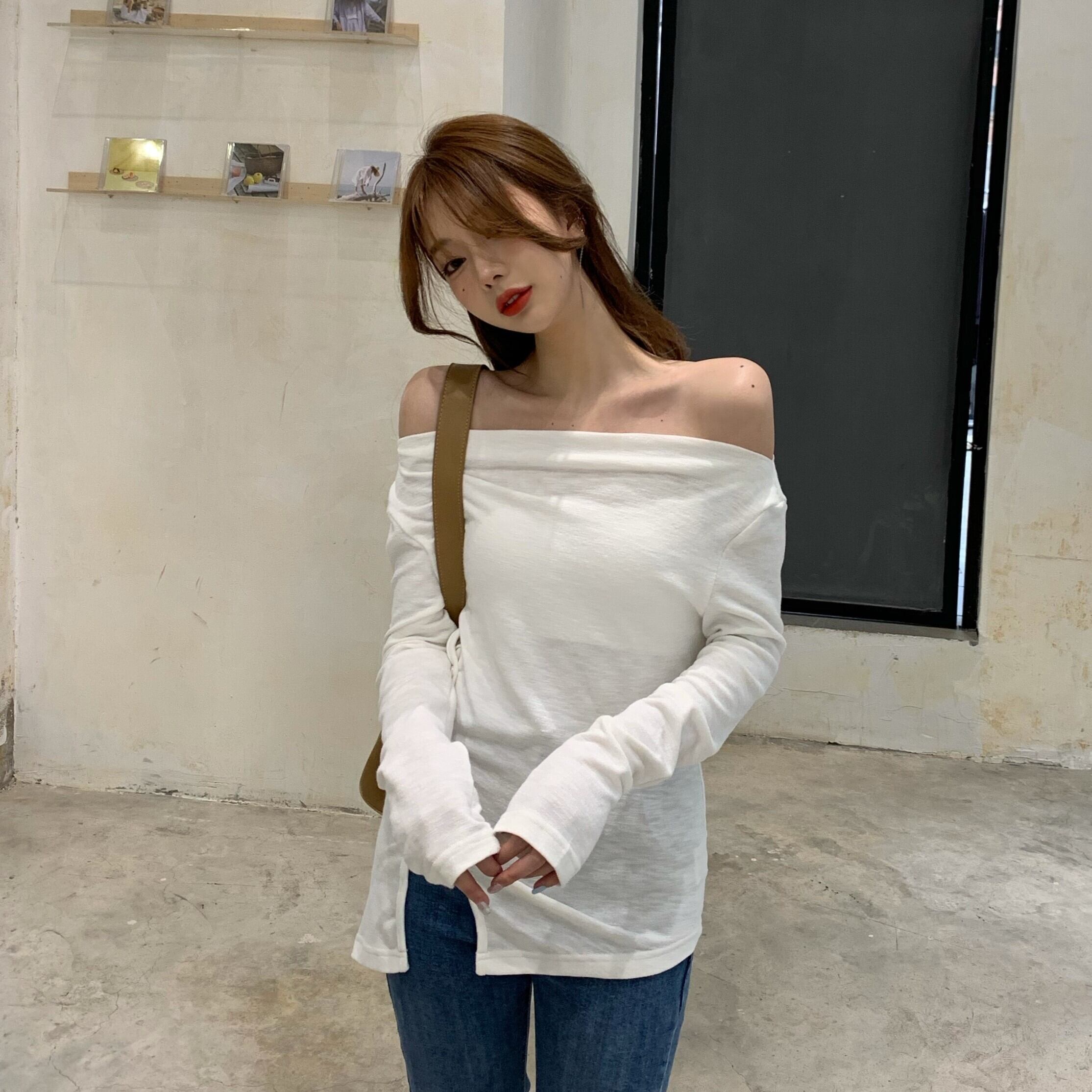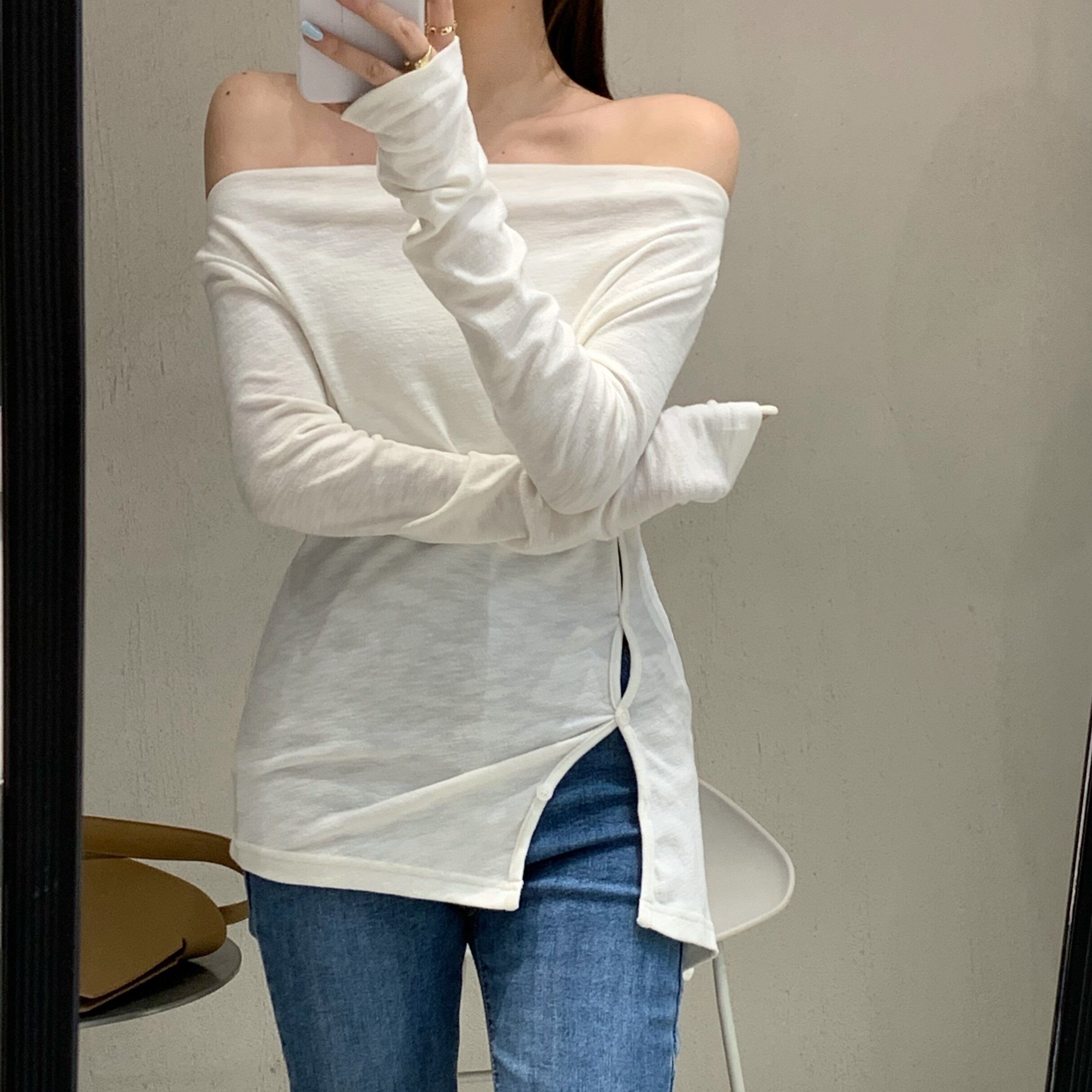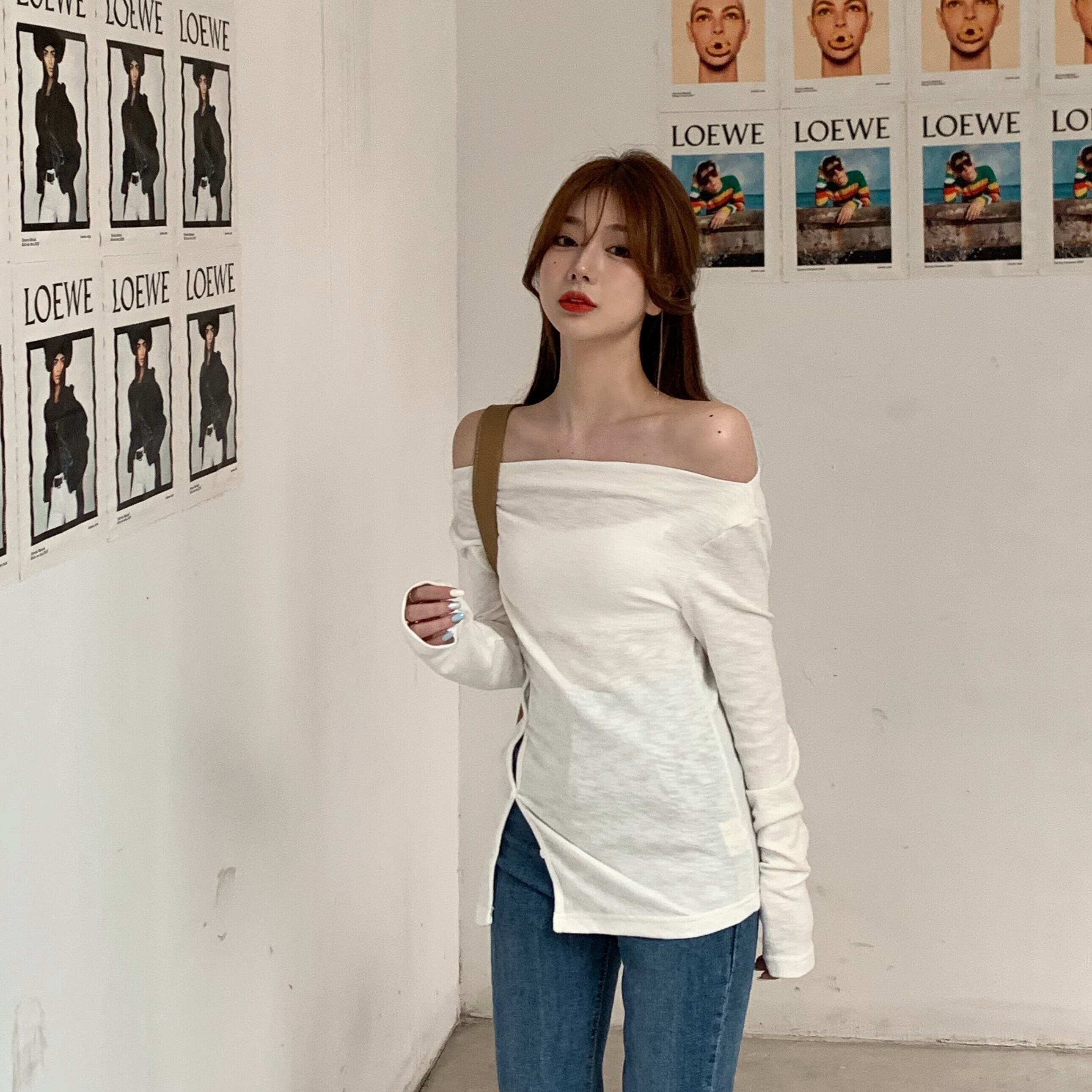 Tシャツシャツ スリムゆったりレディーススプリング夏服ブラックトップス ロング 春物 夏物 オフショルダー 長袖 YY16722780632