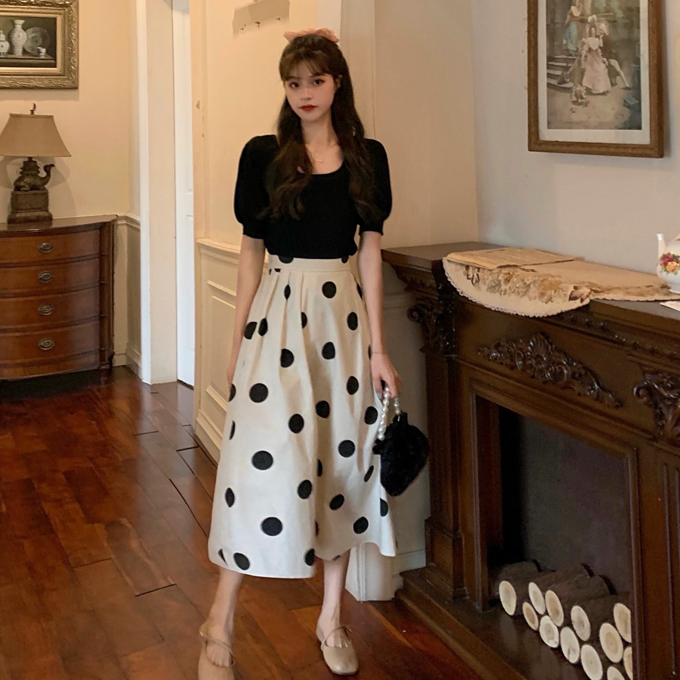 色:ブラックニットトップワンピース,Xingboドットスカートワンピース