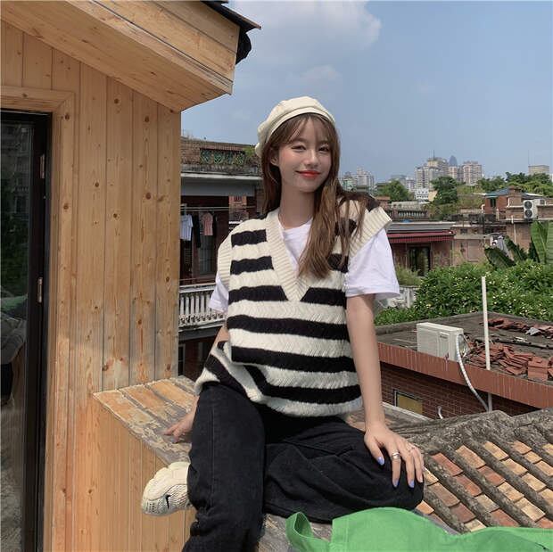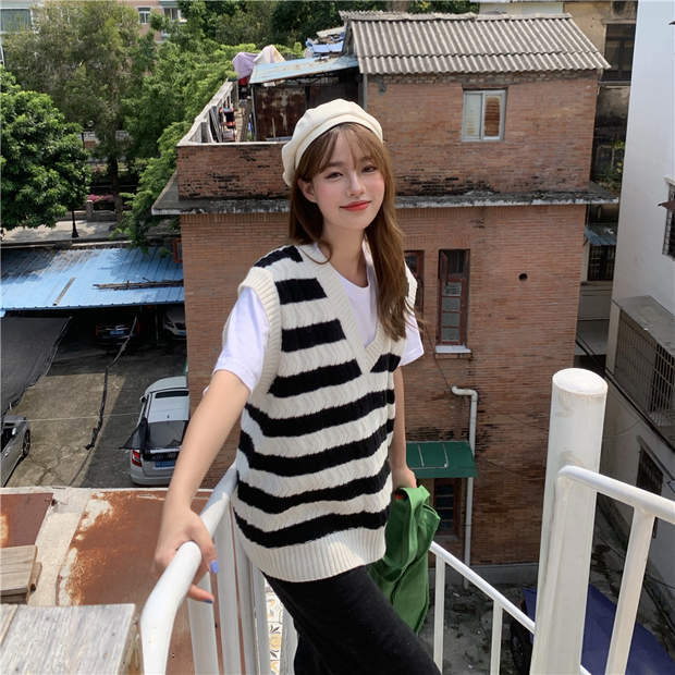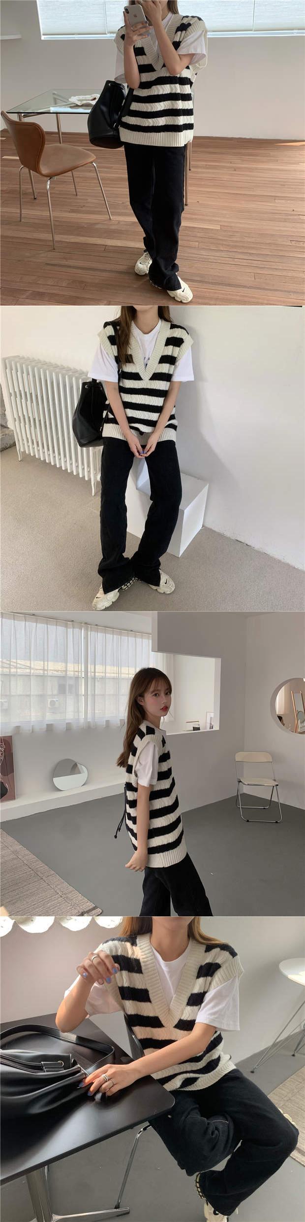 ルーズVネックカラーニットストライプ MONROE76007974437