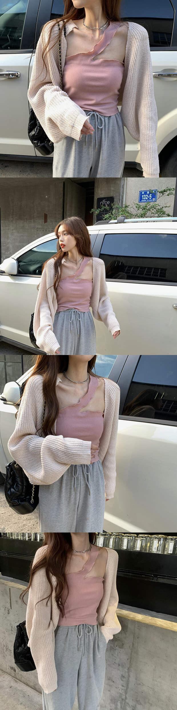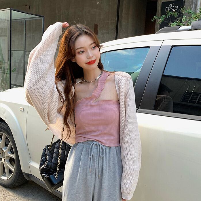 色:ブラックカーディガンセーター,アプリコットカーディガンセーター,ブラックキャミソール,ピンクサスペンダートップ