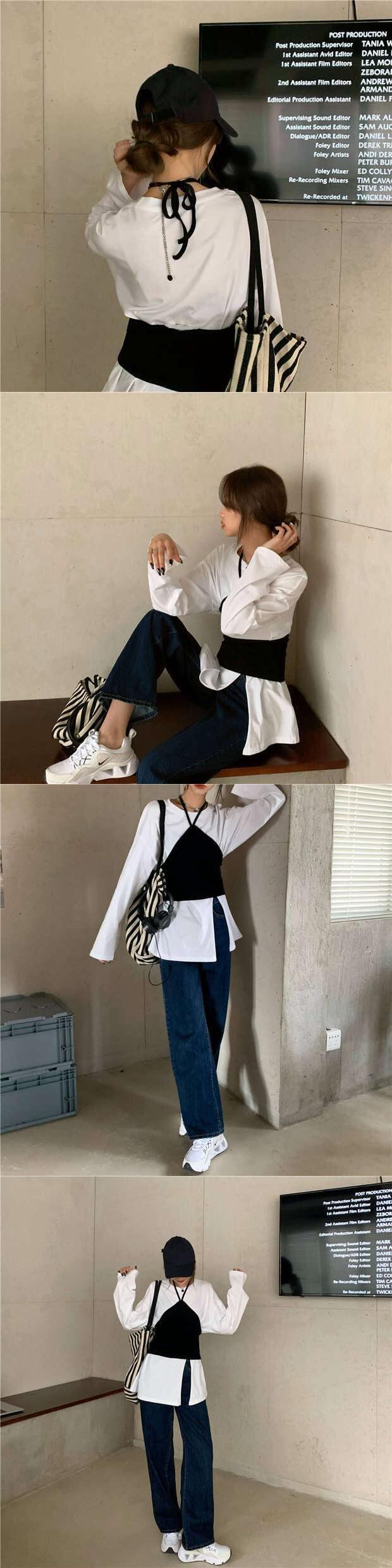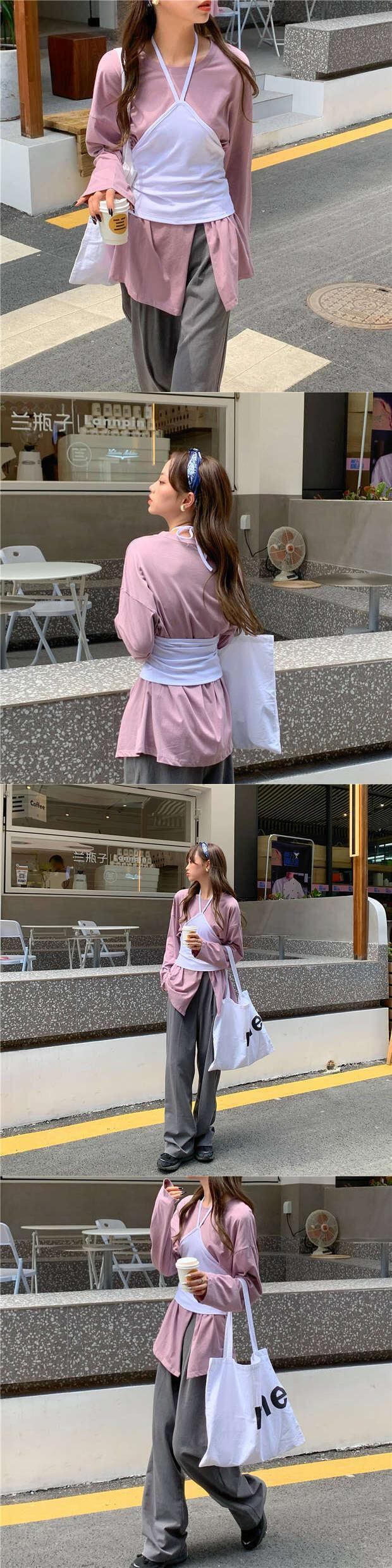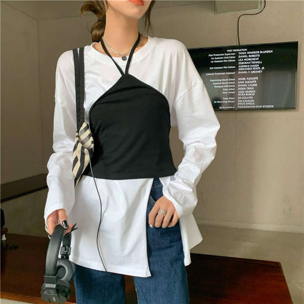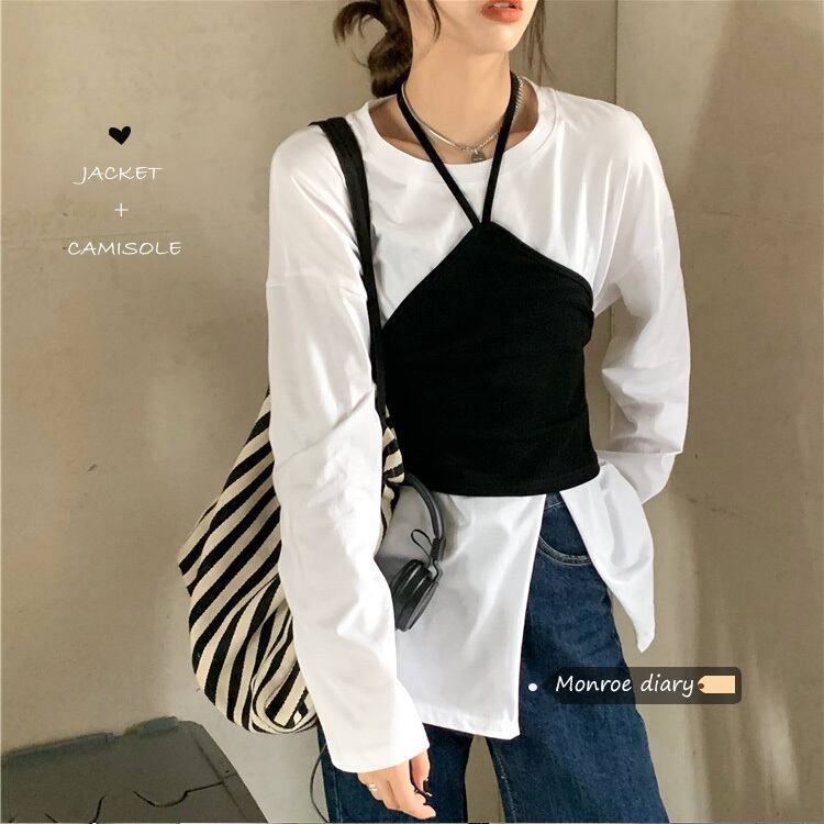 トレンドホワイトTシャツ秋物韓国ファッションスタイルルーズスリットトップス ロング オータム 長袖 ミドル丈 MONROE6985487
