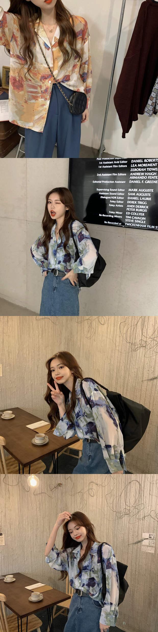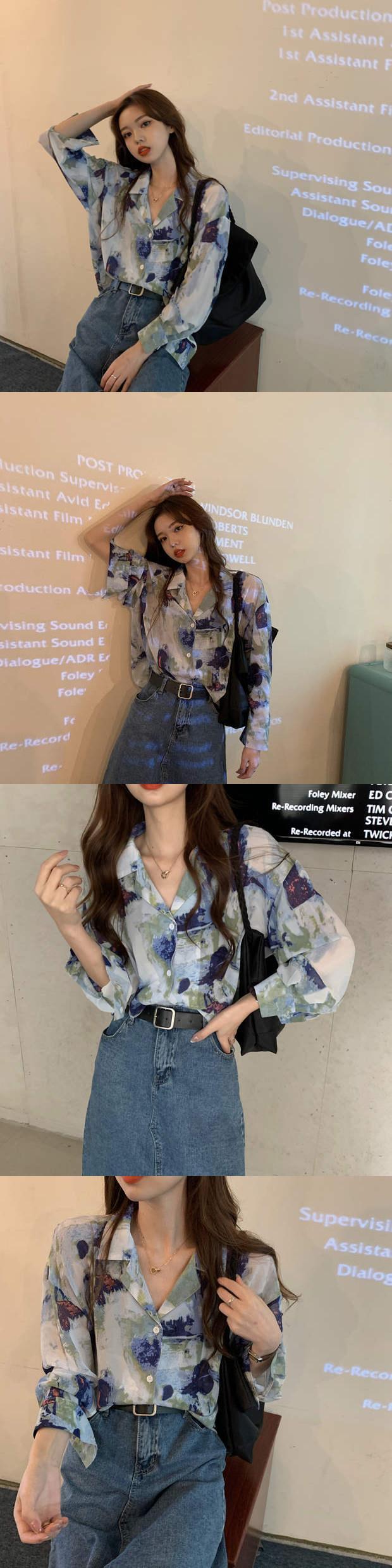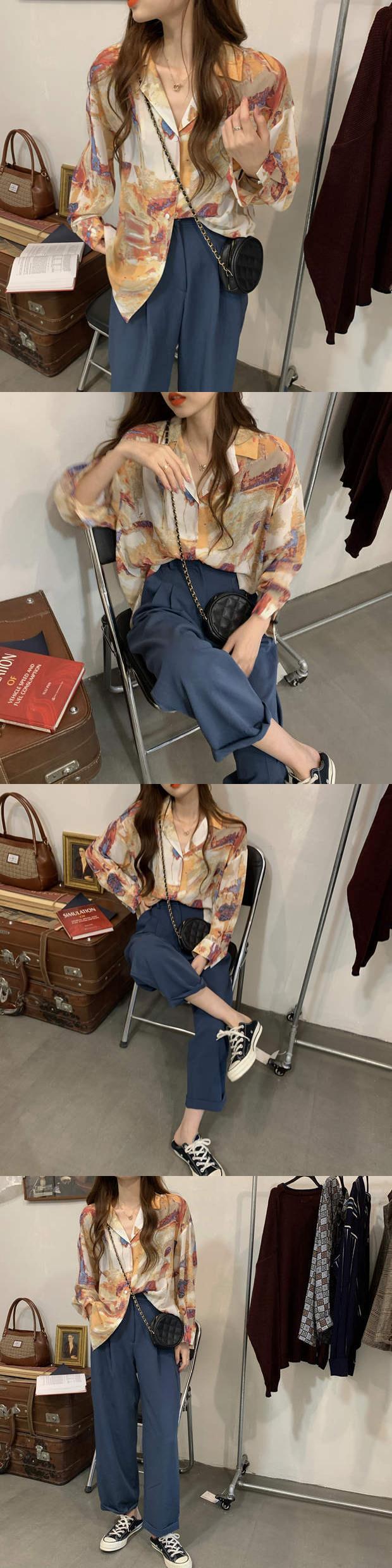 スタンダードプリント柄シャツ 秋物トップス ロング レトロ オータム 長袖 ミドル丈 MONROE71043940633