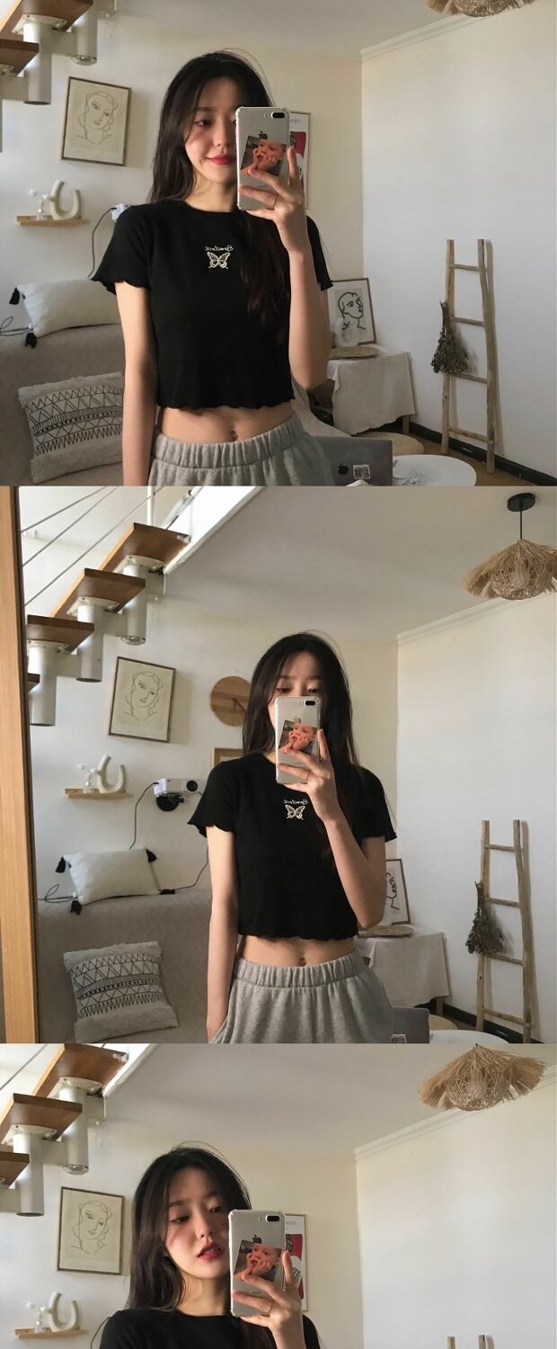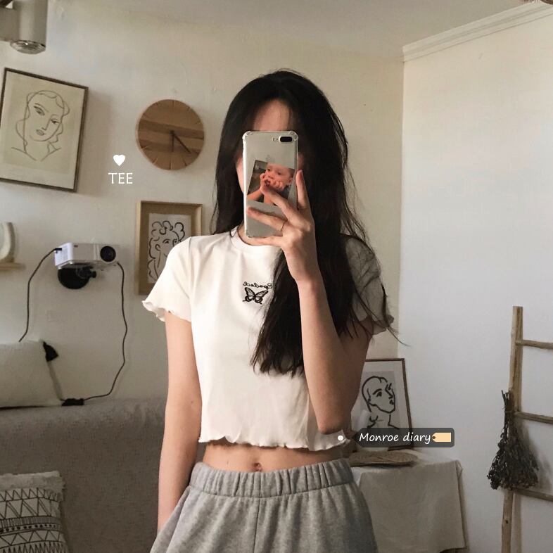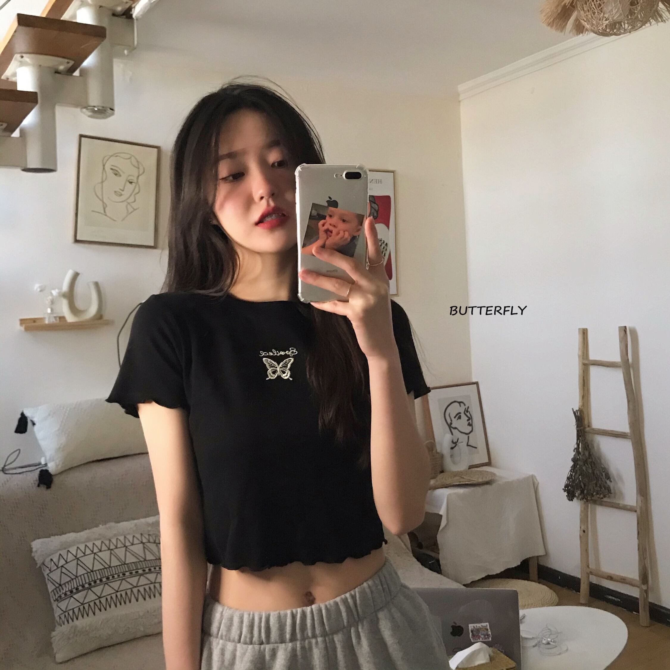 半袖スリーブホワイトButterflyデザイン Tシャツトレンド夏服ハイウェストウェストクロップドトップス ショート レッド コットン ハーフスリーブ 刺繍 夏物 ピュア ウエスト MONROE6737246