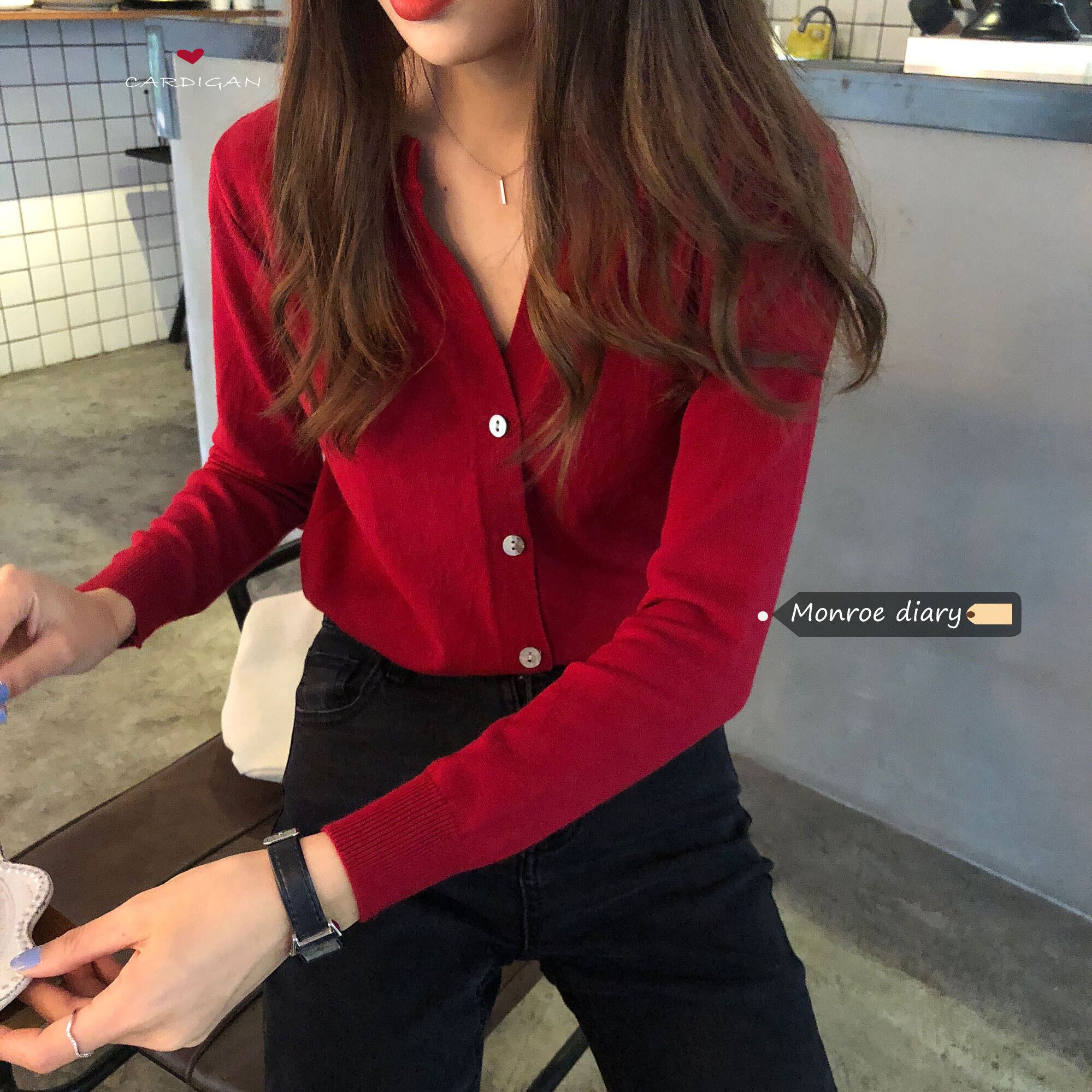 レッドセーター カーディガンVネックジャケット 秋物ルーズトップス ロング オータム 長袖 ミドル丈 MONROE93889647357