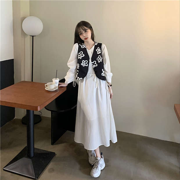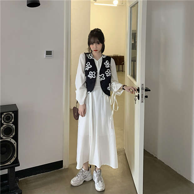 ホワイトワンピース秋物ルーズVネックスカート ハイウェストウェストロング オータム ウエスト ミドル丈 MONROE7068328