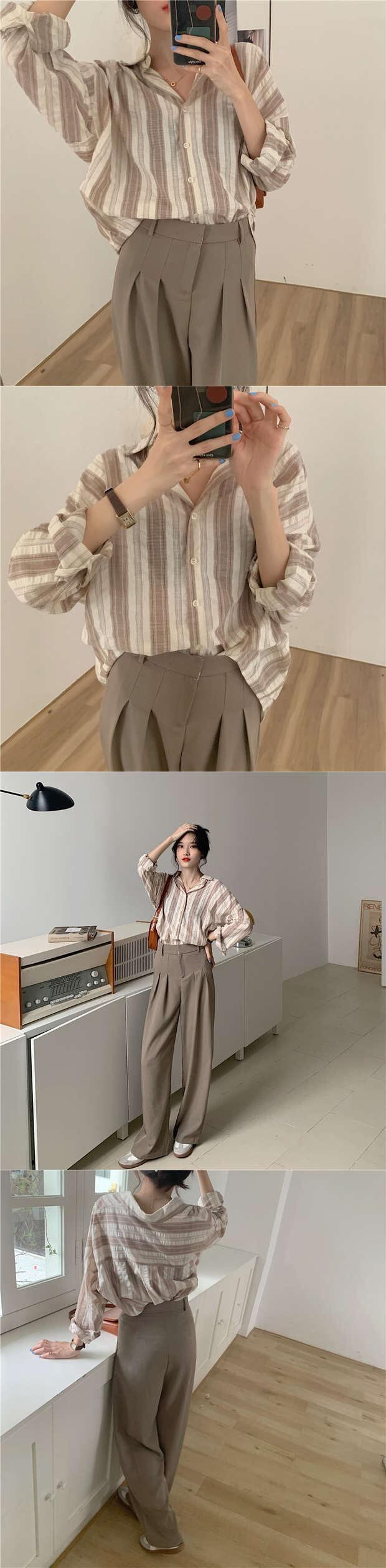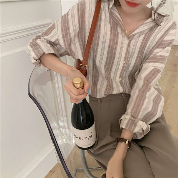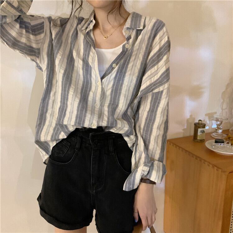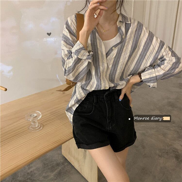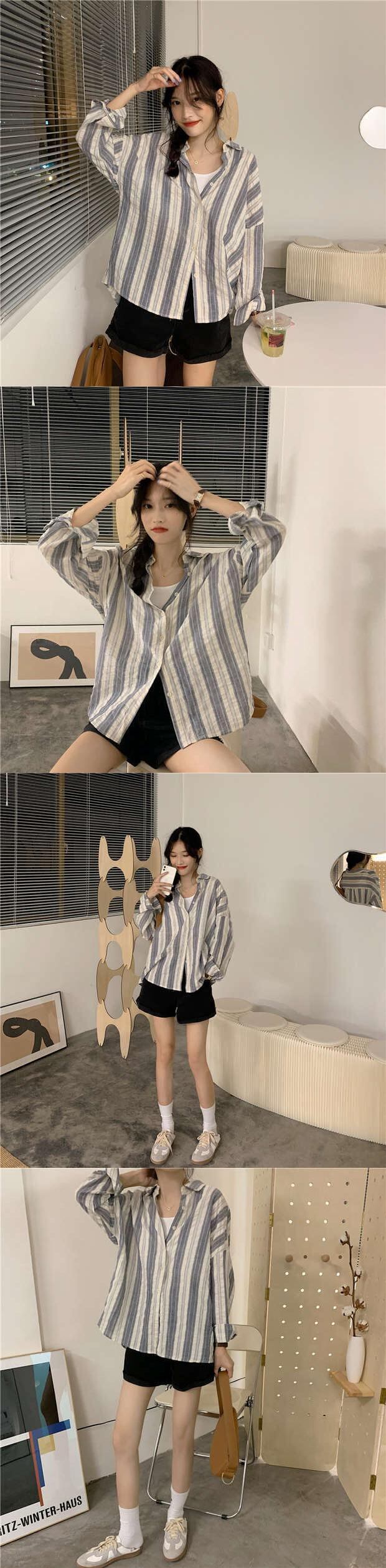 ストライプシャツ 秋物韓国ファッションルーズトップス ロング オータム 長袖 ミドル丈 MONROE84541283285